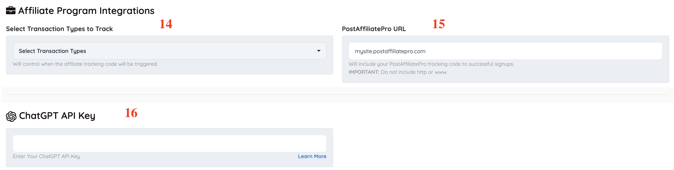 This setting will include the PostAffiliatePro tracking code to successful signups. IMPORTANT: Do not include http or www.