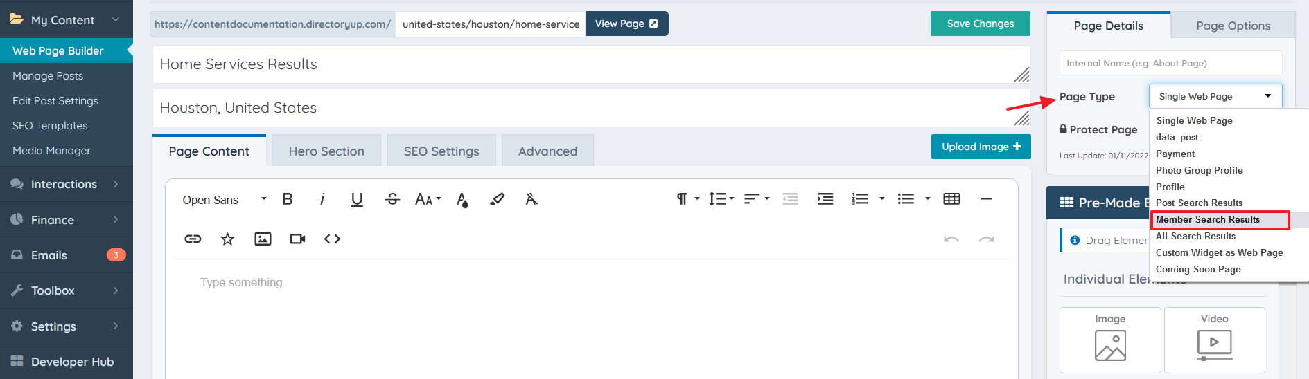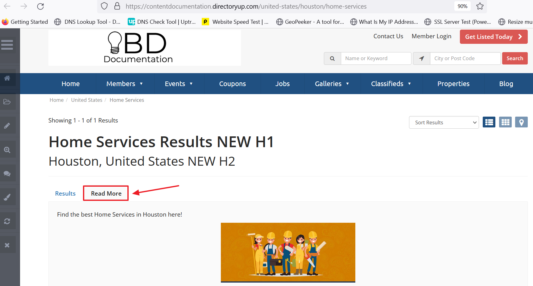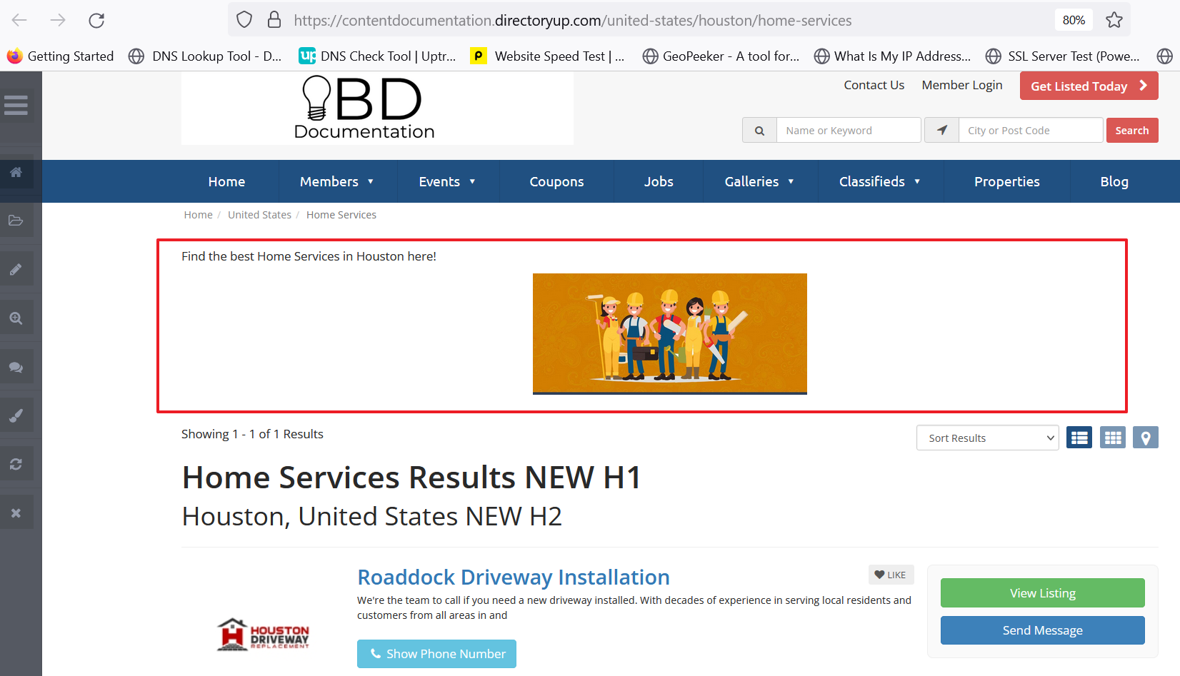 Next, navigate to the "Pretty" URL version of the member search results page that will be edited. In this example, the "Pretty" URL version of the page is located at /united-states/houston/home-services/.