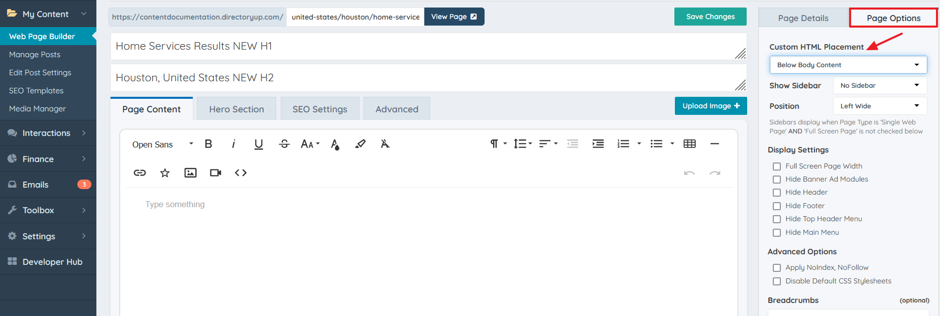 Now there are different options for how the content will display on the page. Select these options in the Display Options Tab under Custom HTML Placement: