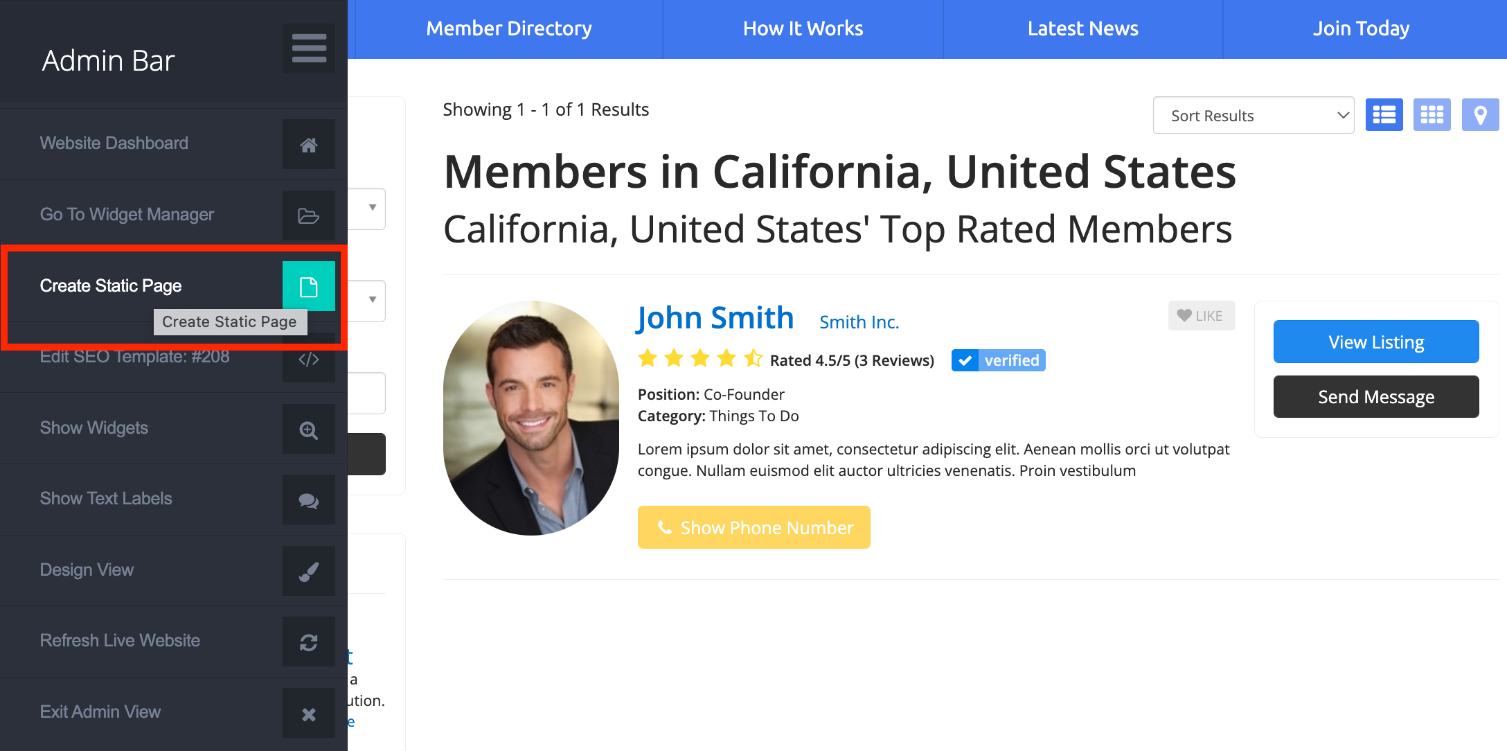 Once on the page, click on the "Create Static Page" icon in the left Admin navigation bar: