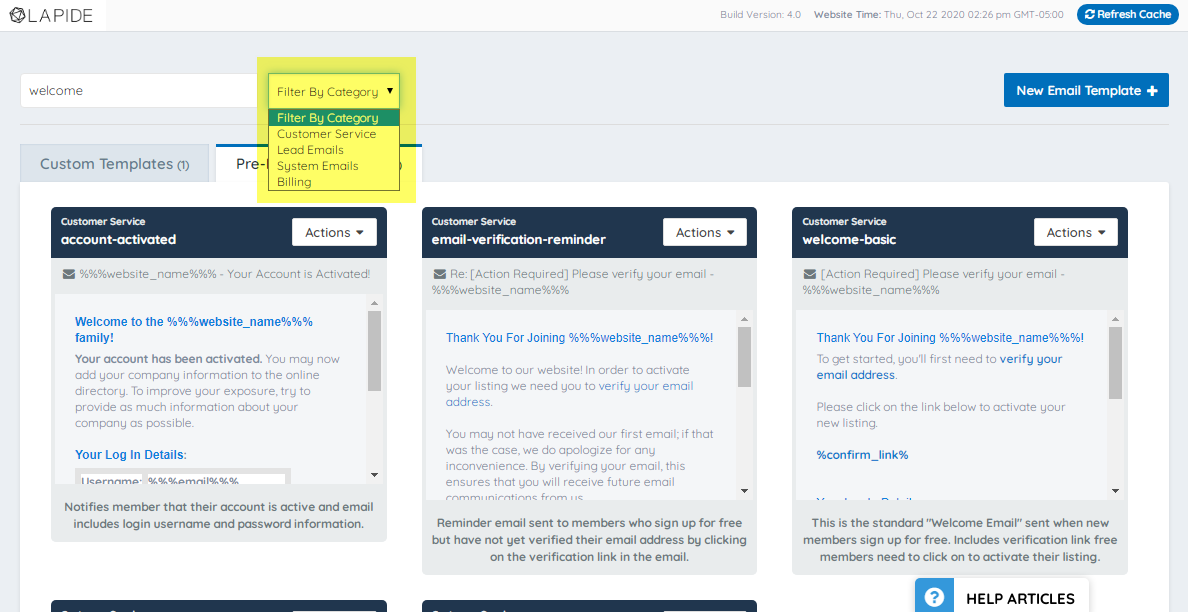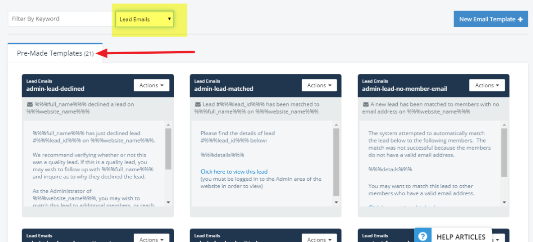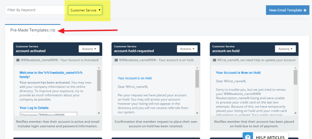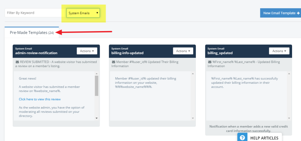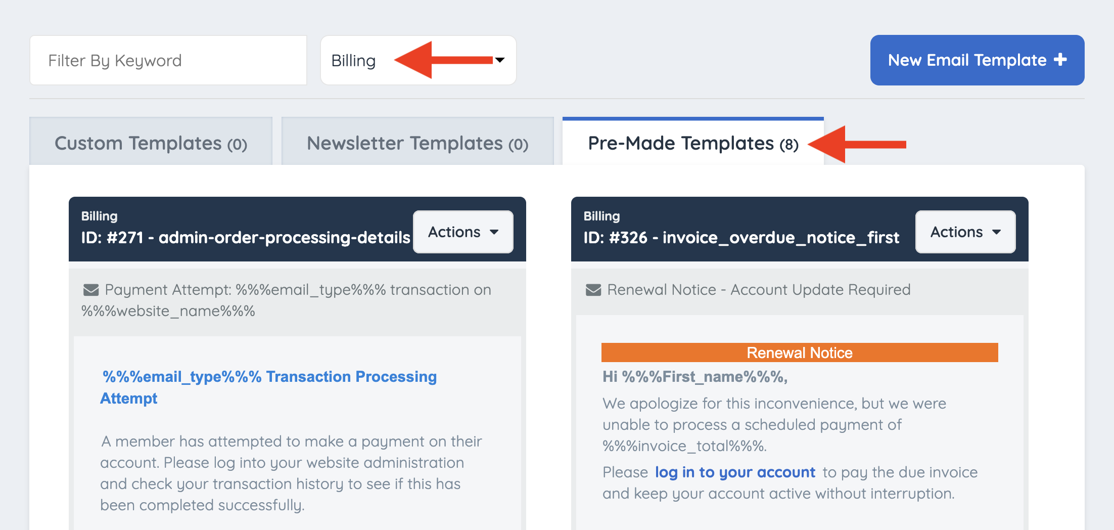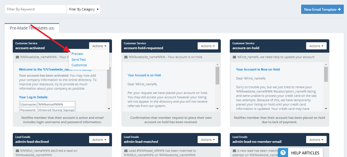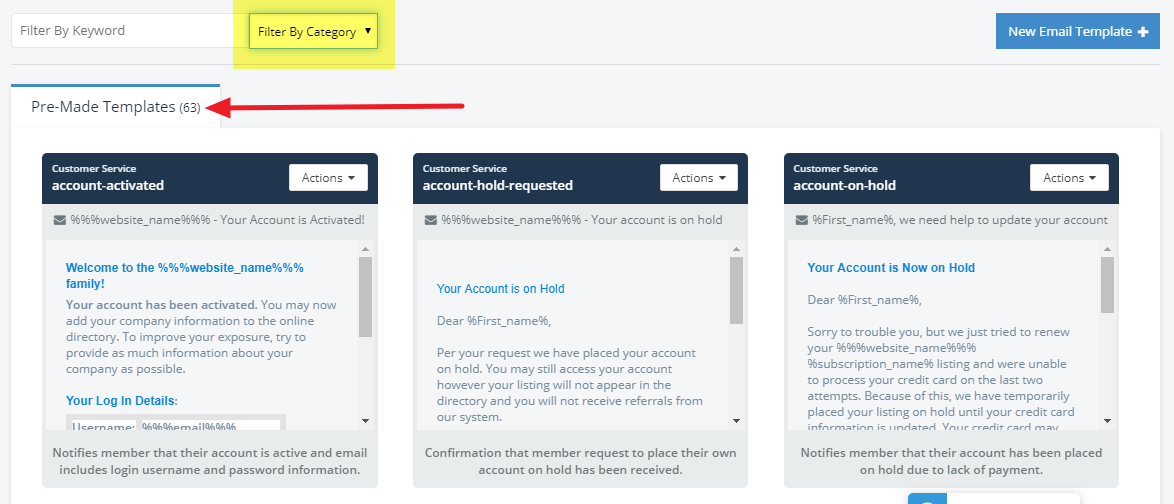 Locate the email template to edit either by scrolling through the list or by searching for keywords in the email template in the “Filter by Keyword” field: