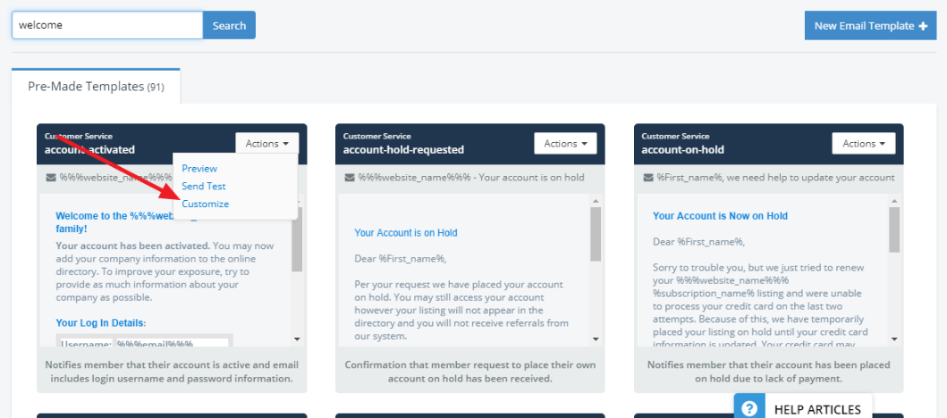 To make further edits to this template that has already been copied to the website, follow steps 1 and 2 above, locate the template in the “Customized Email Templates” section of the page, and click on the “Edit” button in the “Actions” drop-down for this email template: