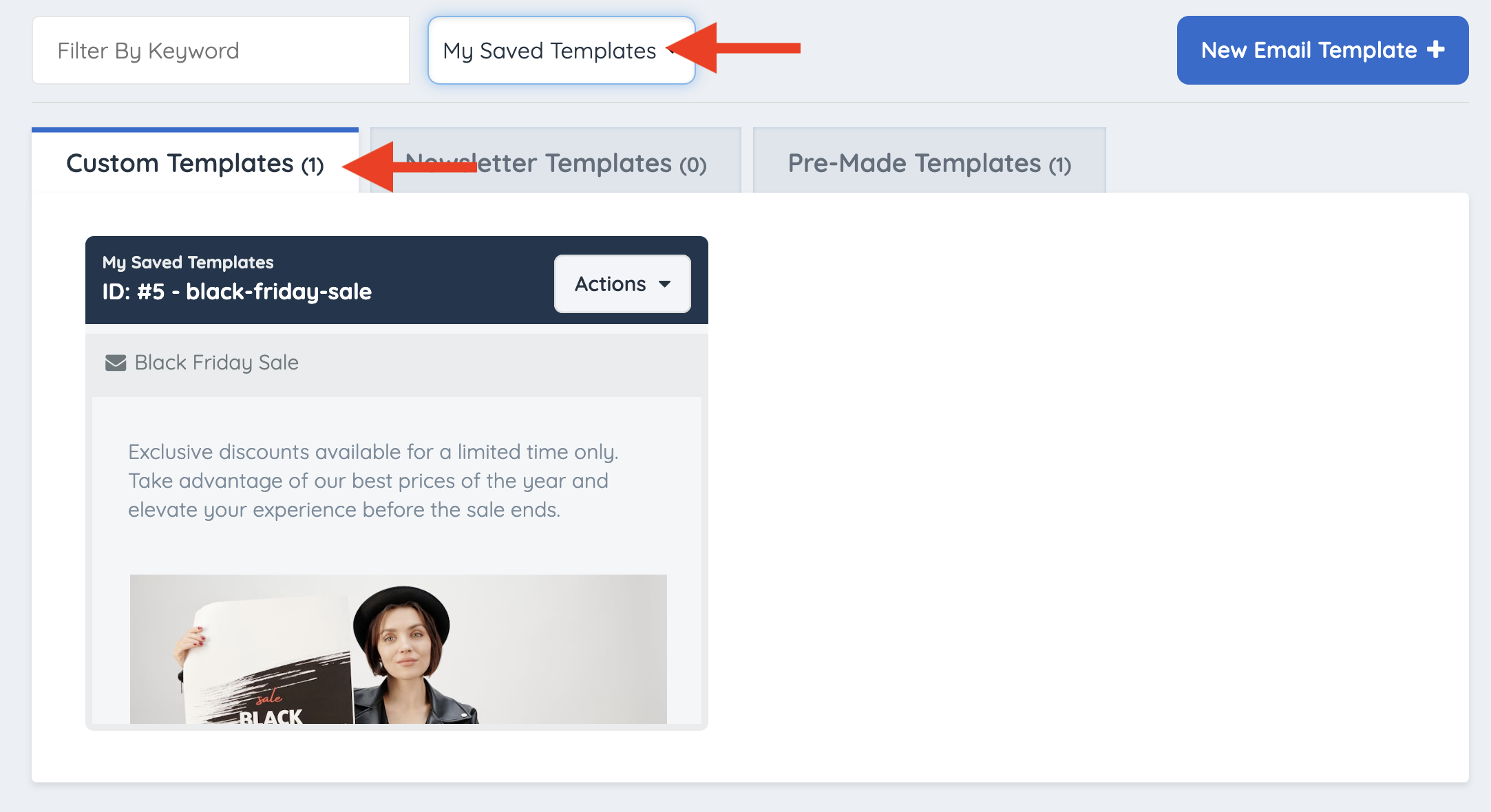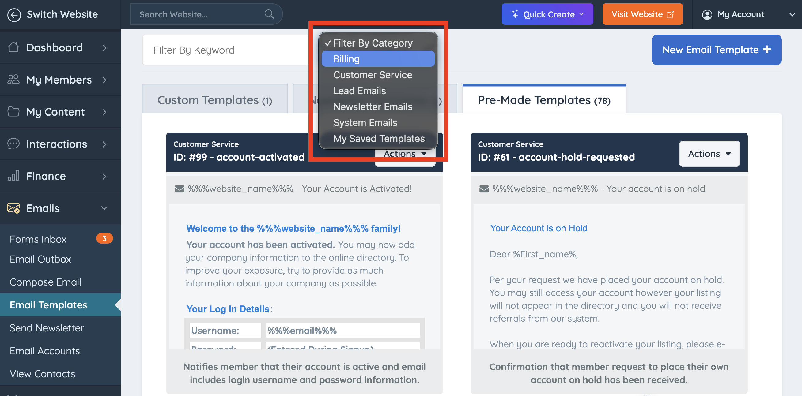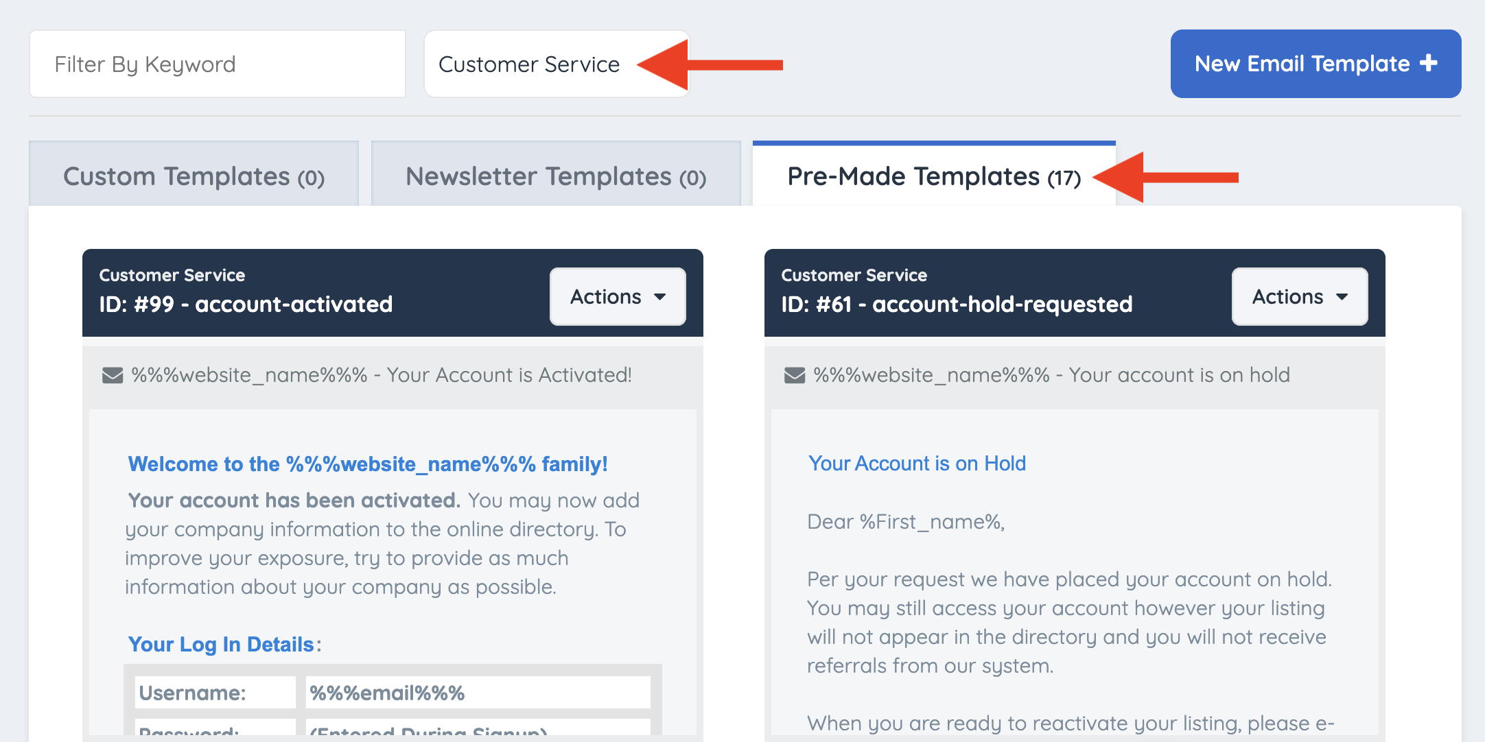 Filter the default email templates by Category: