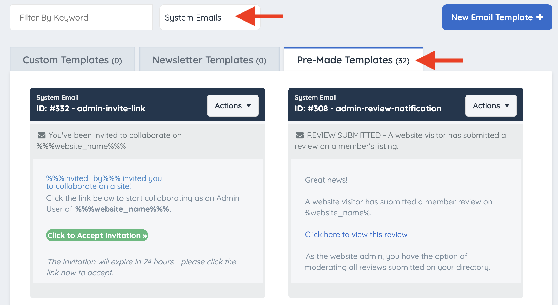 System Emails have a total of 32 templates: