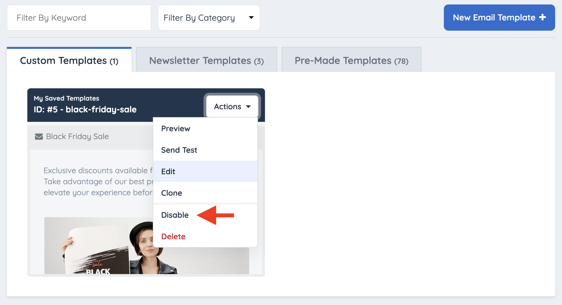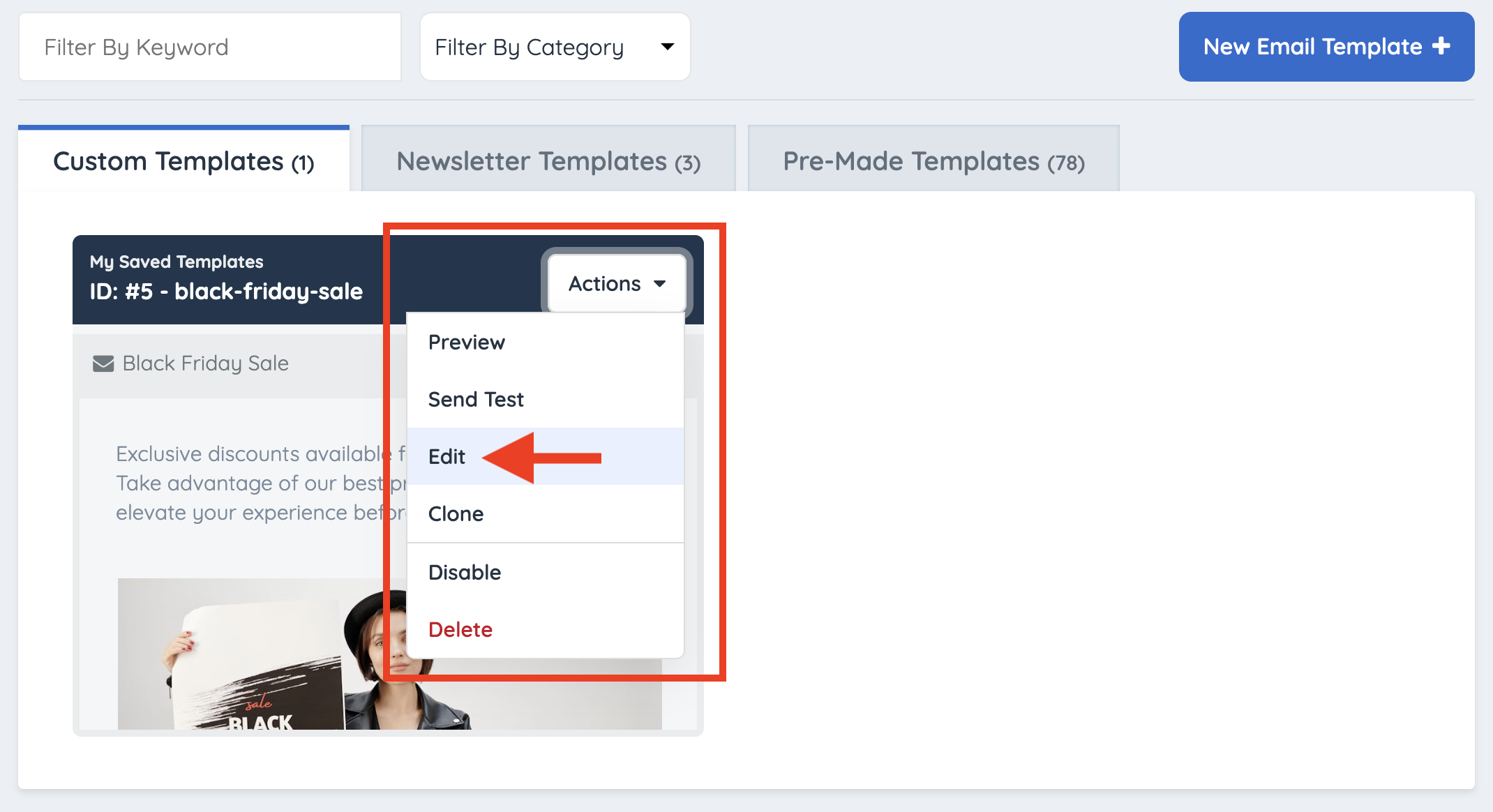 Filter by Category has all the email templates with a total of 78.