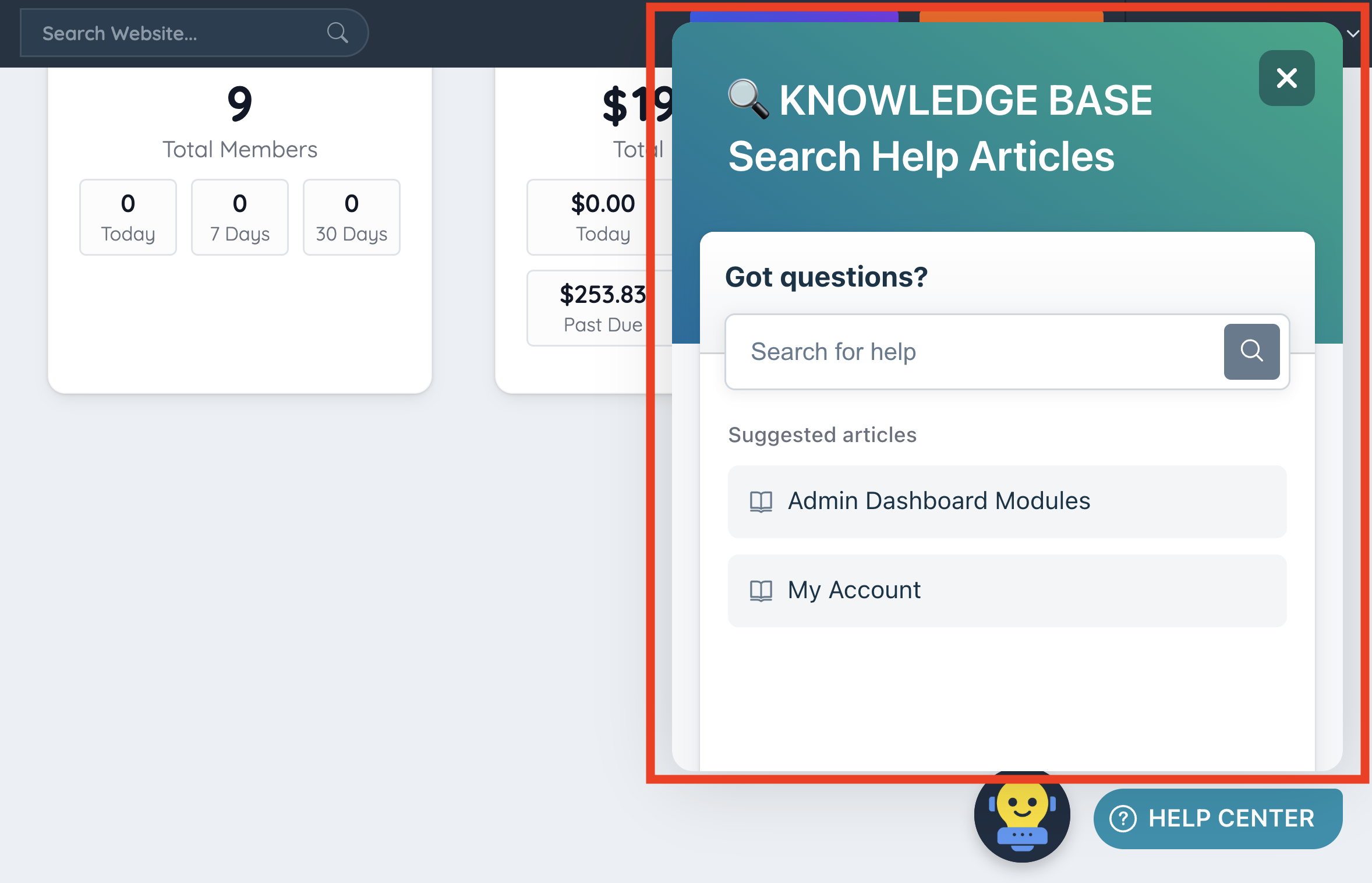 Here articles and videos relevant to the page will appear as well as a search bar to search for additional topics within that section of the Admin: