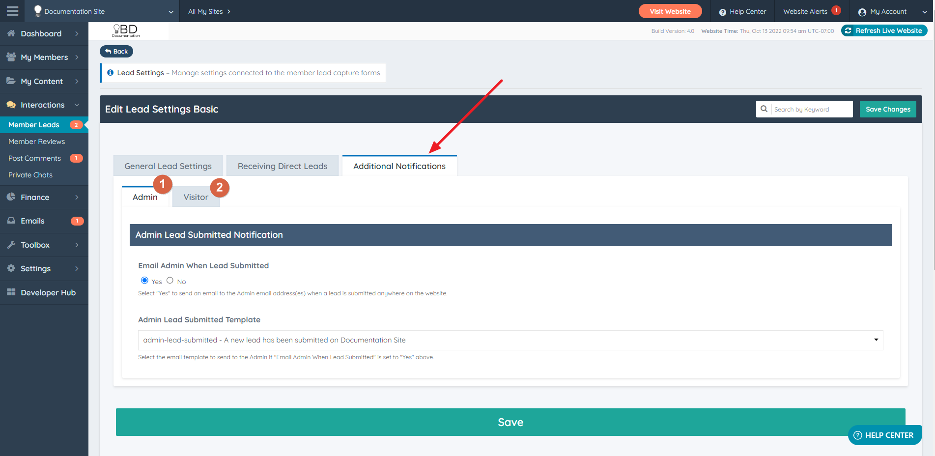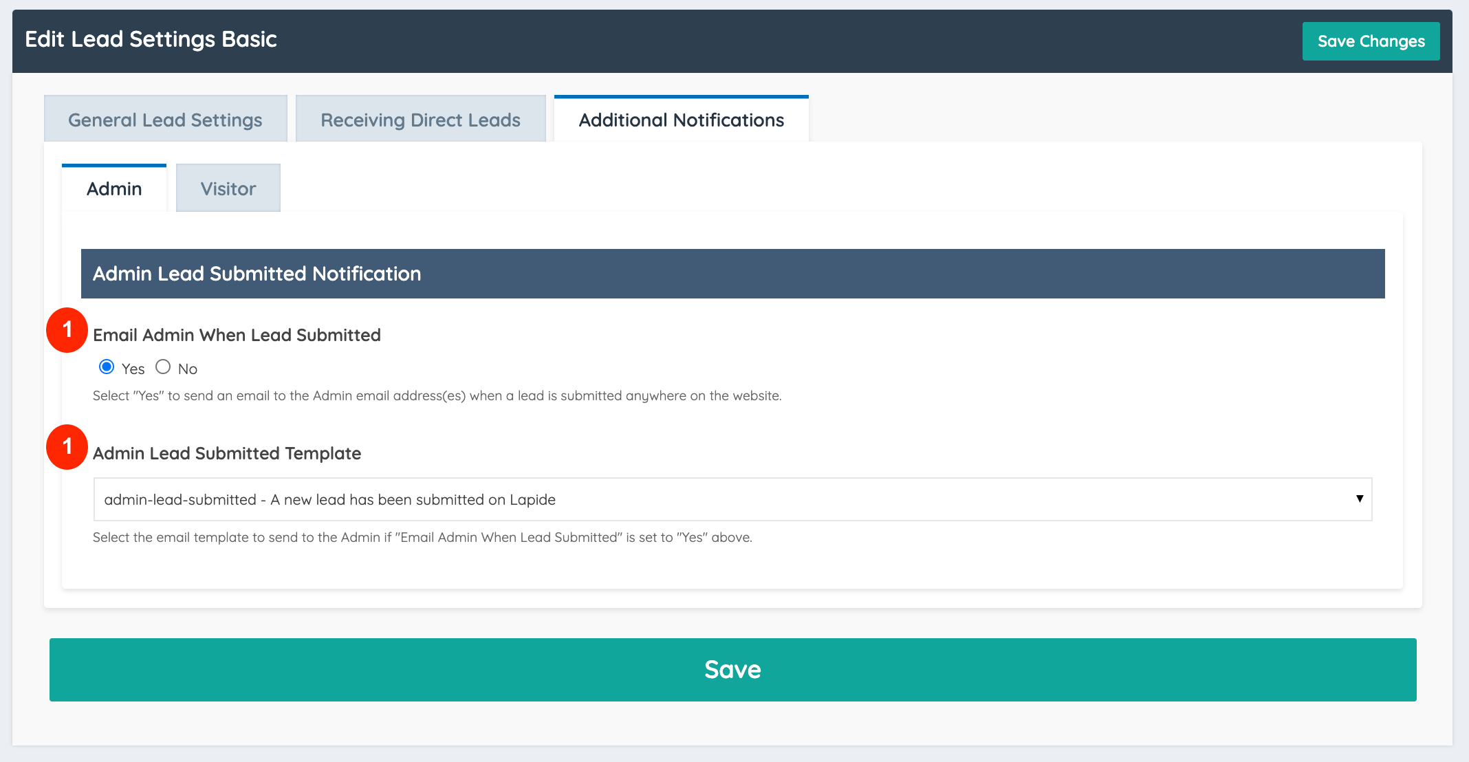 Select "Yes" to send an email to the Admin email address(es) when a lead is submitted anywhere on the website. - Admin Lead Submitted Template:
