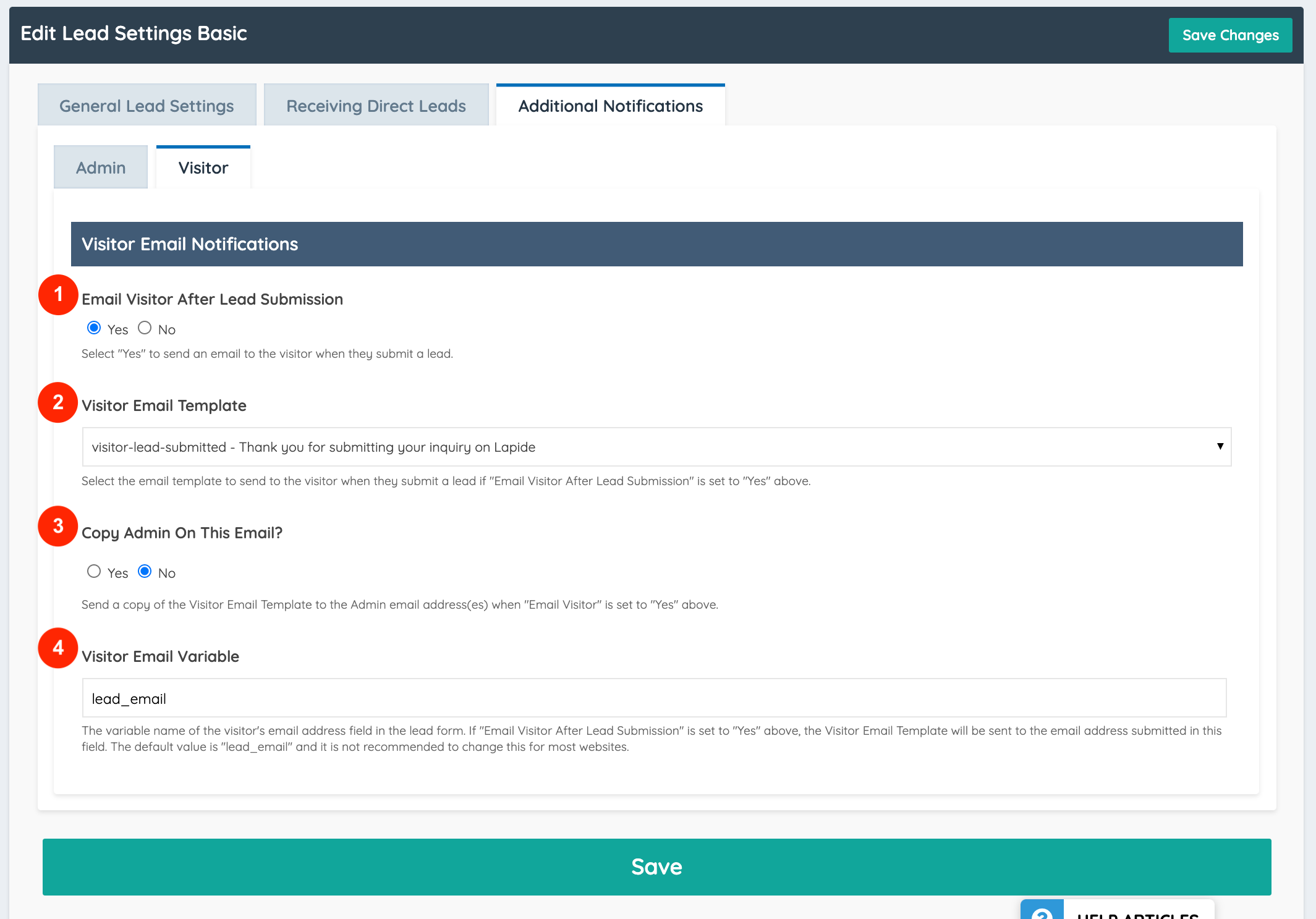 Select "Yes" to send an email to the visitor when they submit a lead. - Visitor Email Template: