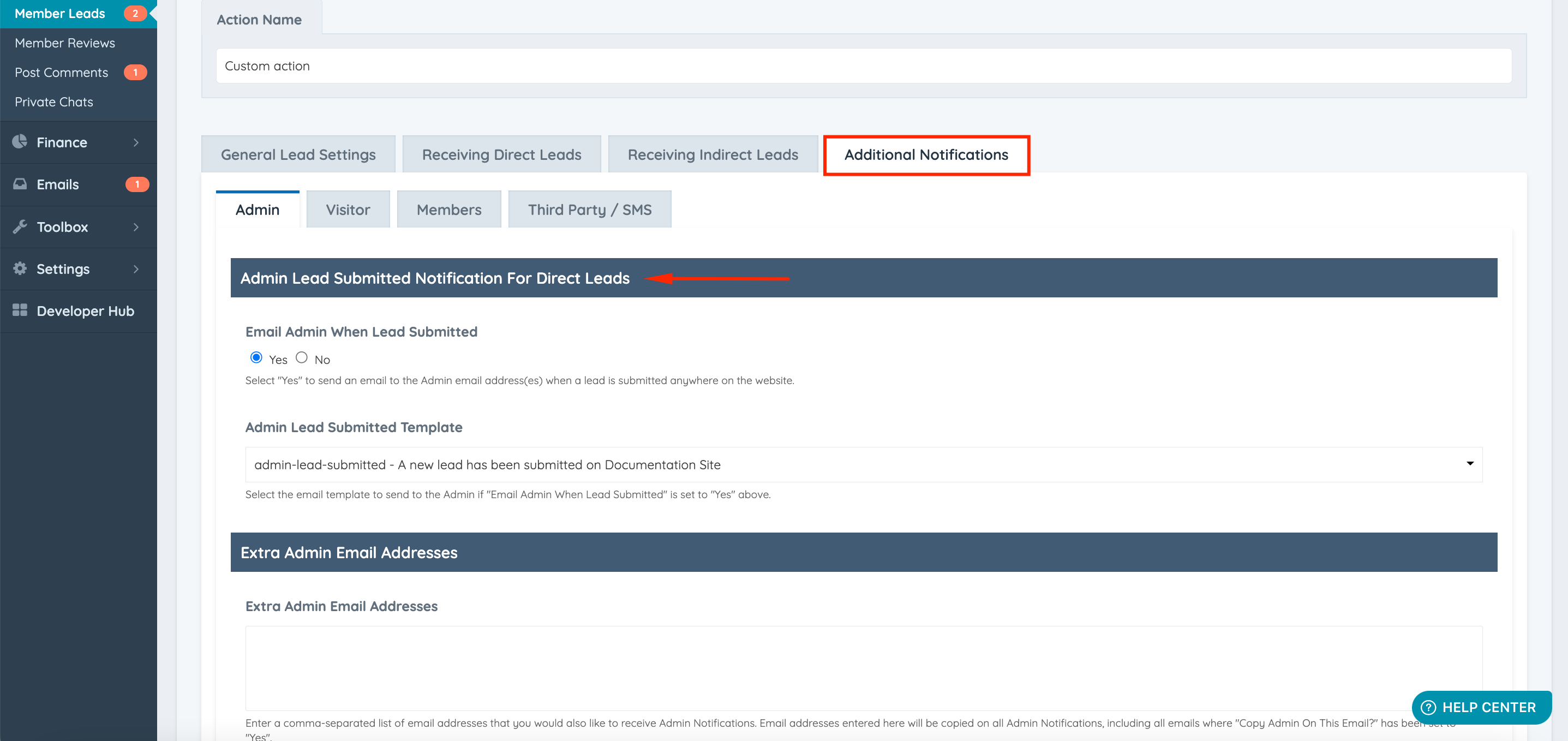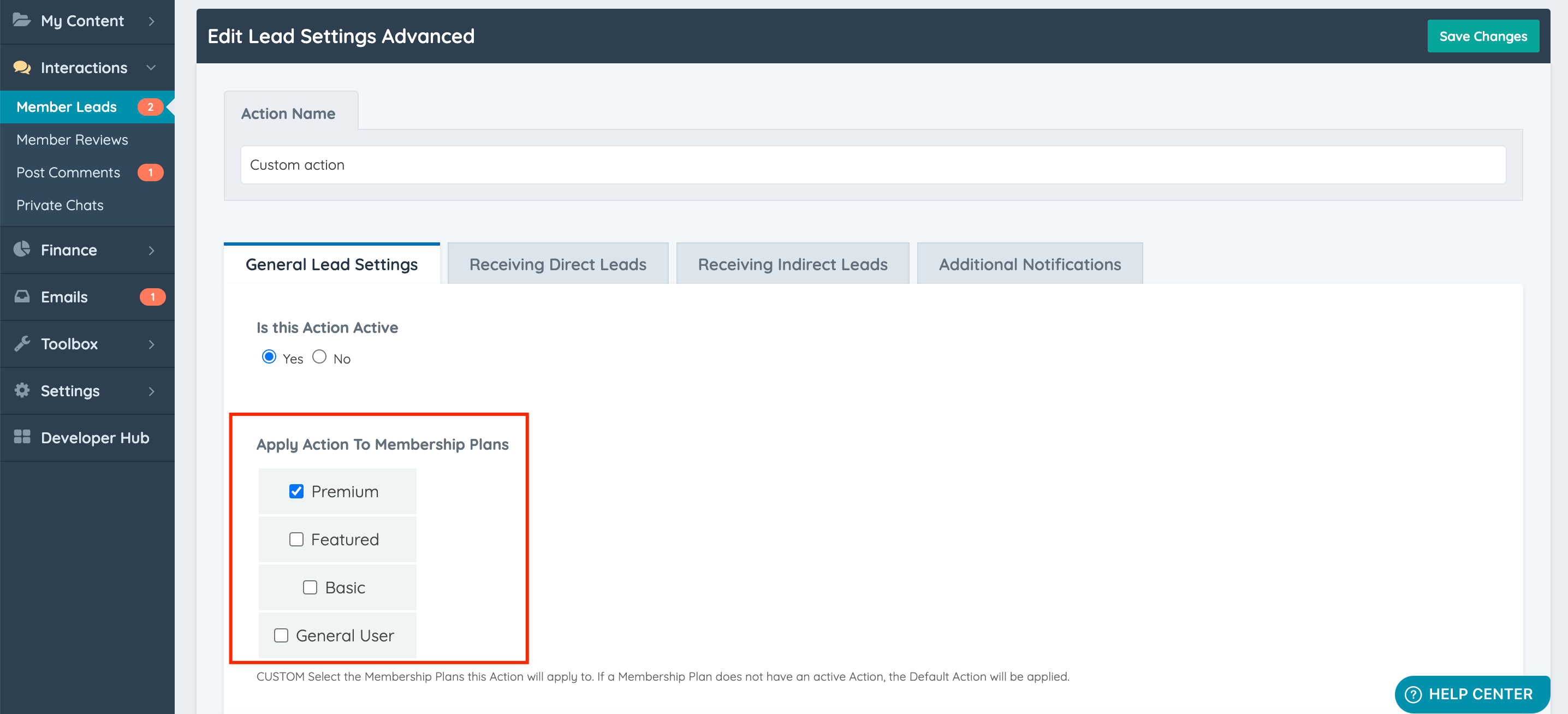 If there are any additional custom actions added, the Lead Submitted notifications set for those actions will only apply to direct leads submitted to the members in Membership Plans affected by this action, which is set in the General Settings tab of the custom action: