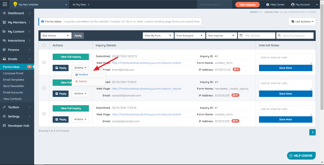 Access contact form submissions by navigating to Emails >> Form Inquiries: