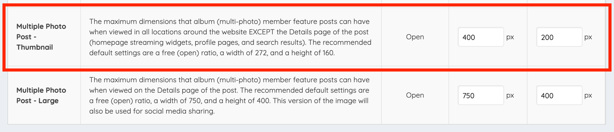 This setting determines the maximum dimensions that multiple-photo member Post Types will have when viewed in most locations around the website (homepage streaming widgets, member profile pages, thumbnails in the album viewer on Details pages, and search results).  The only place this setting does not apply is the Large version of the image on the Details page of the post (the single page devoted to the full post).  The setting for the size of the large version of the photo on the Details page of the post is set by the "Multiple Photos Post - Large" setting (see the section below).  The recommended default settings are a free (open) ratio, a width of 272, and a height of 160.