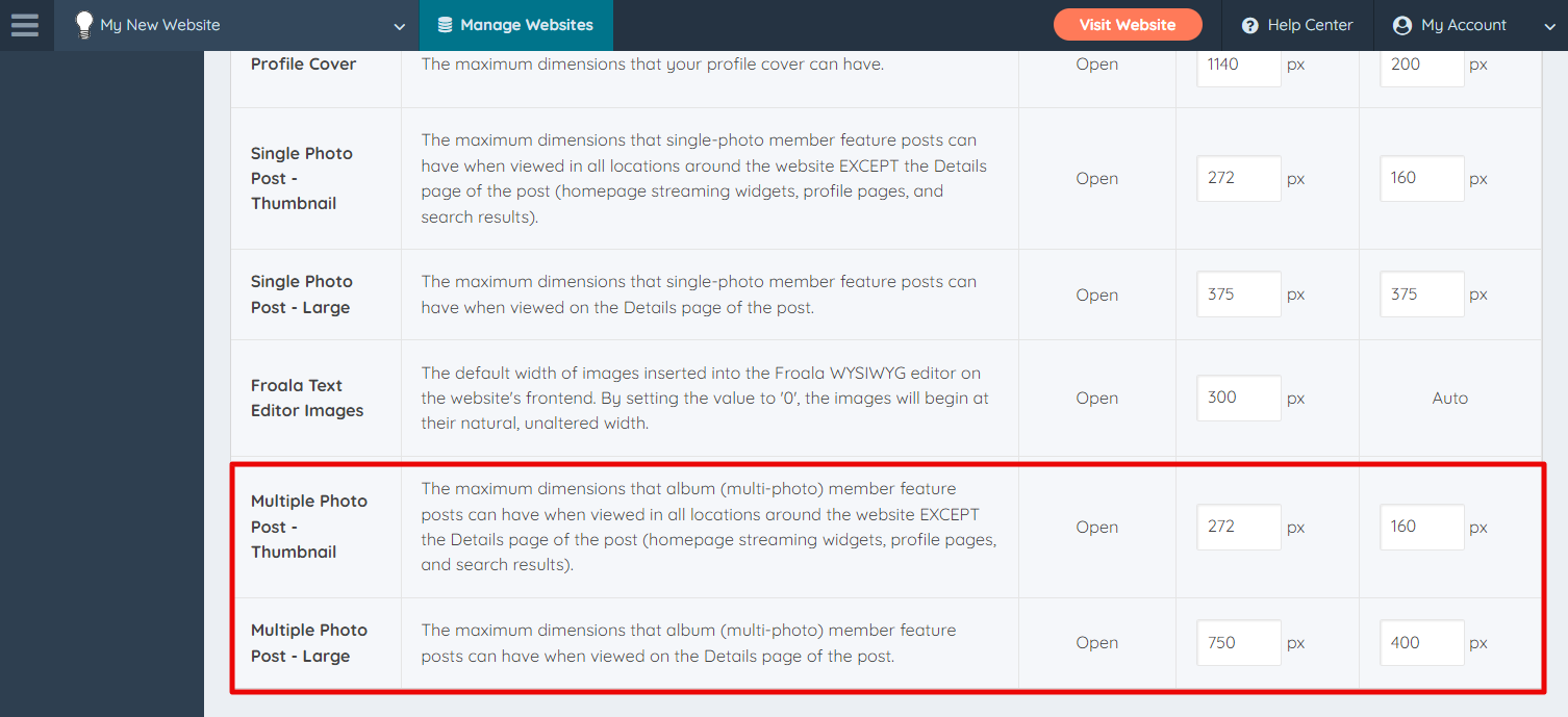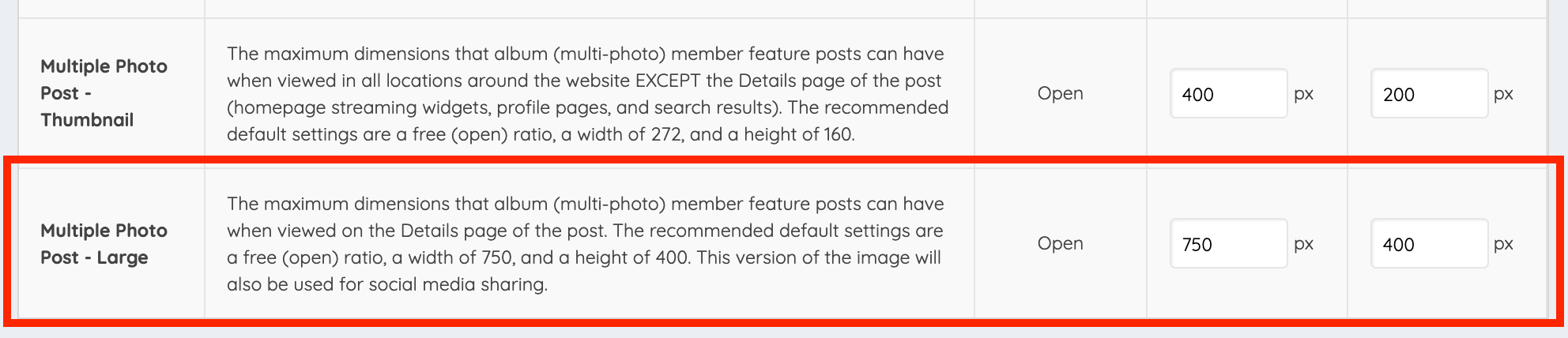 This setting determines the maximum dimensions that multiple-photo member feature posts will have when viewed as the primary photo in the album viewer on the Details page of the post (the single page devoted to the full post).