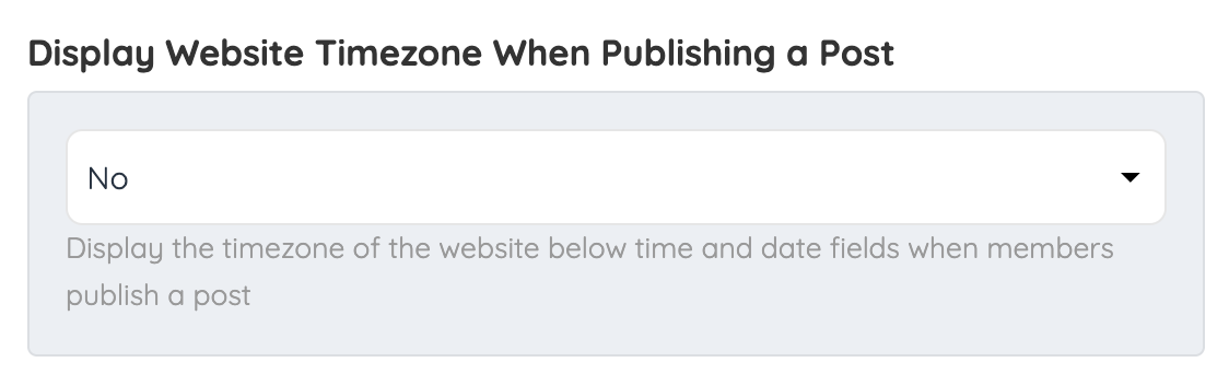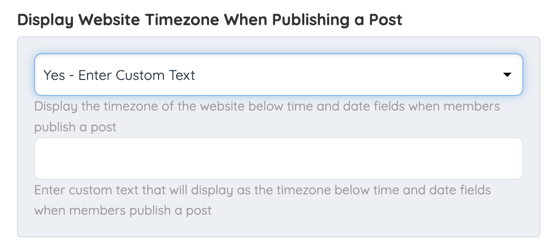 Admins can enter custom text that will display as the timezone below time and date fields when members publish a post.
