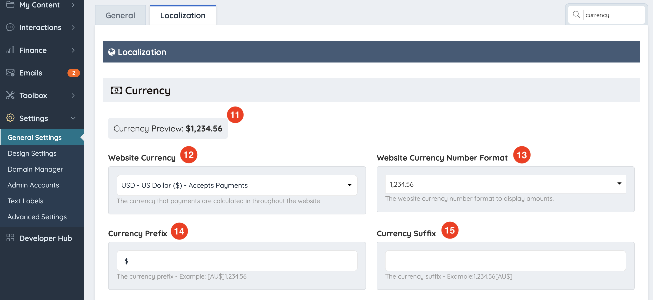These settings control how the website displays and processes currency, including the symbol, format, and placement - ensuring consistency for both admin and member transactions.
