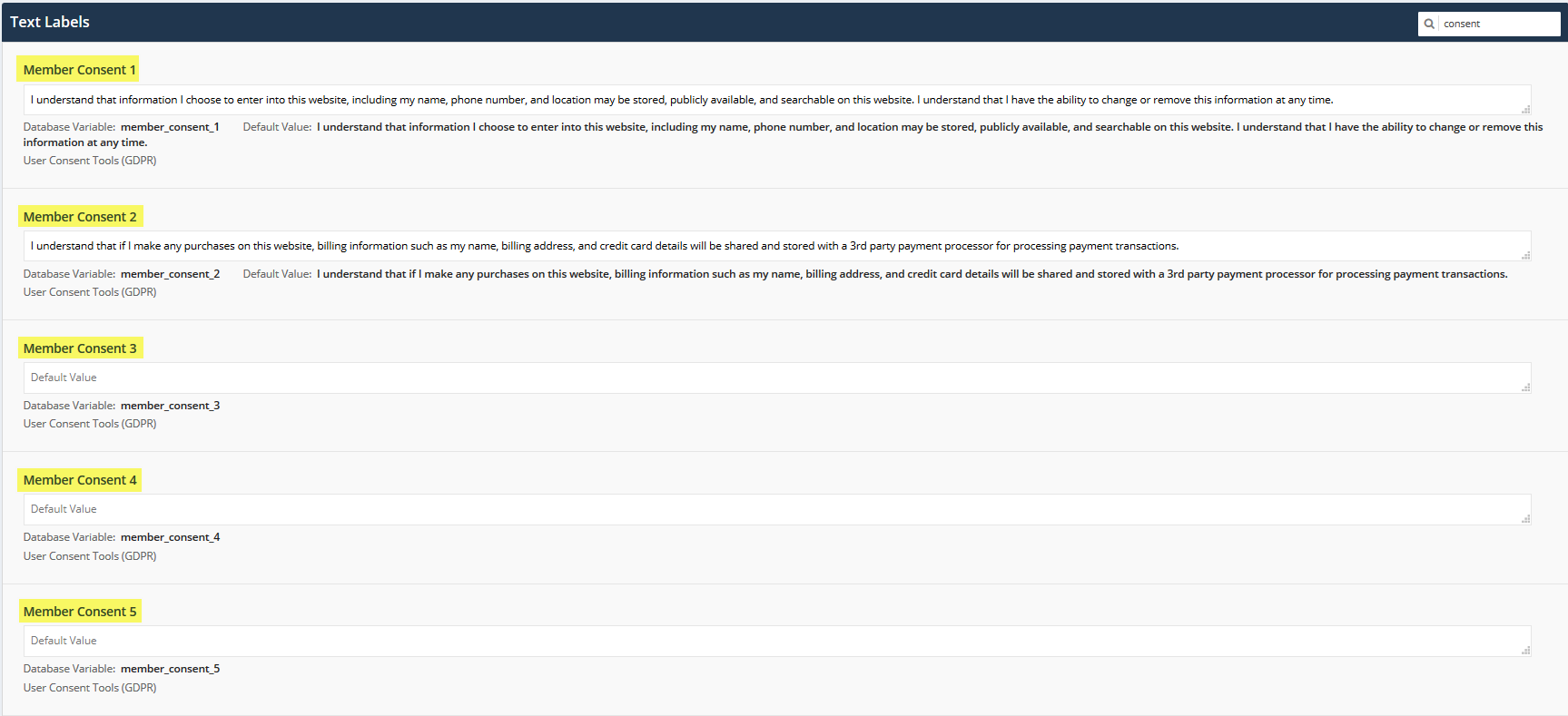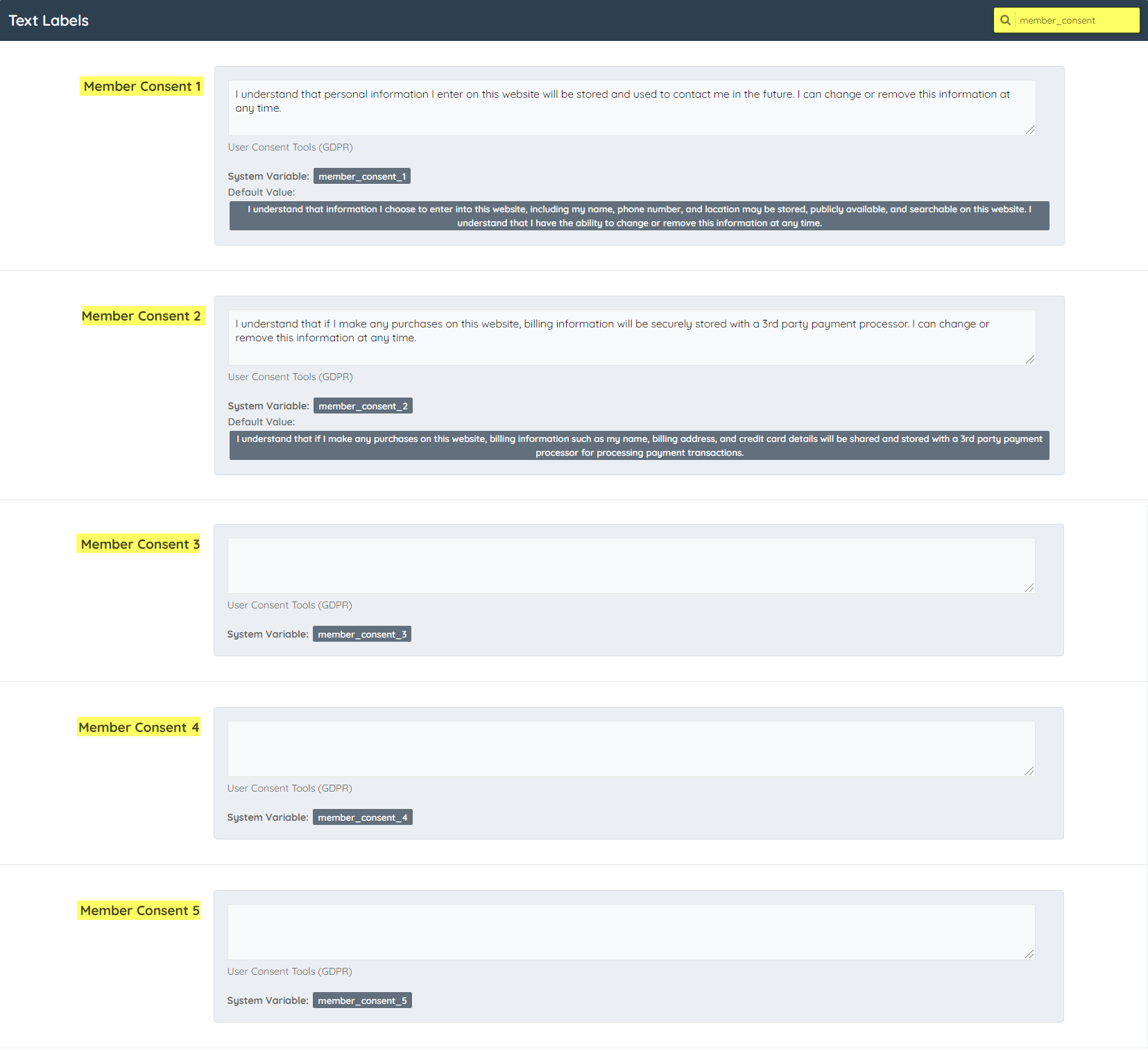 The number of the text label relates to the order it will appear in the form. For example, the text in the "member_consent_1" Text Label will be the text of the first consent checkbox related to members, "member_consent_2", will be the second consent item, etc.