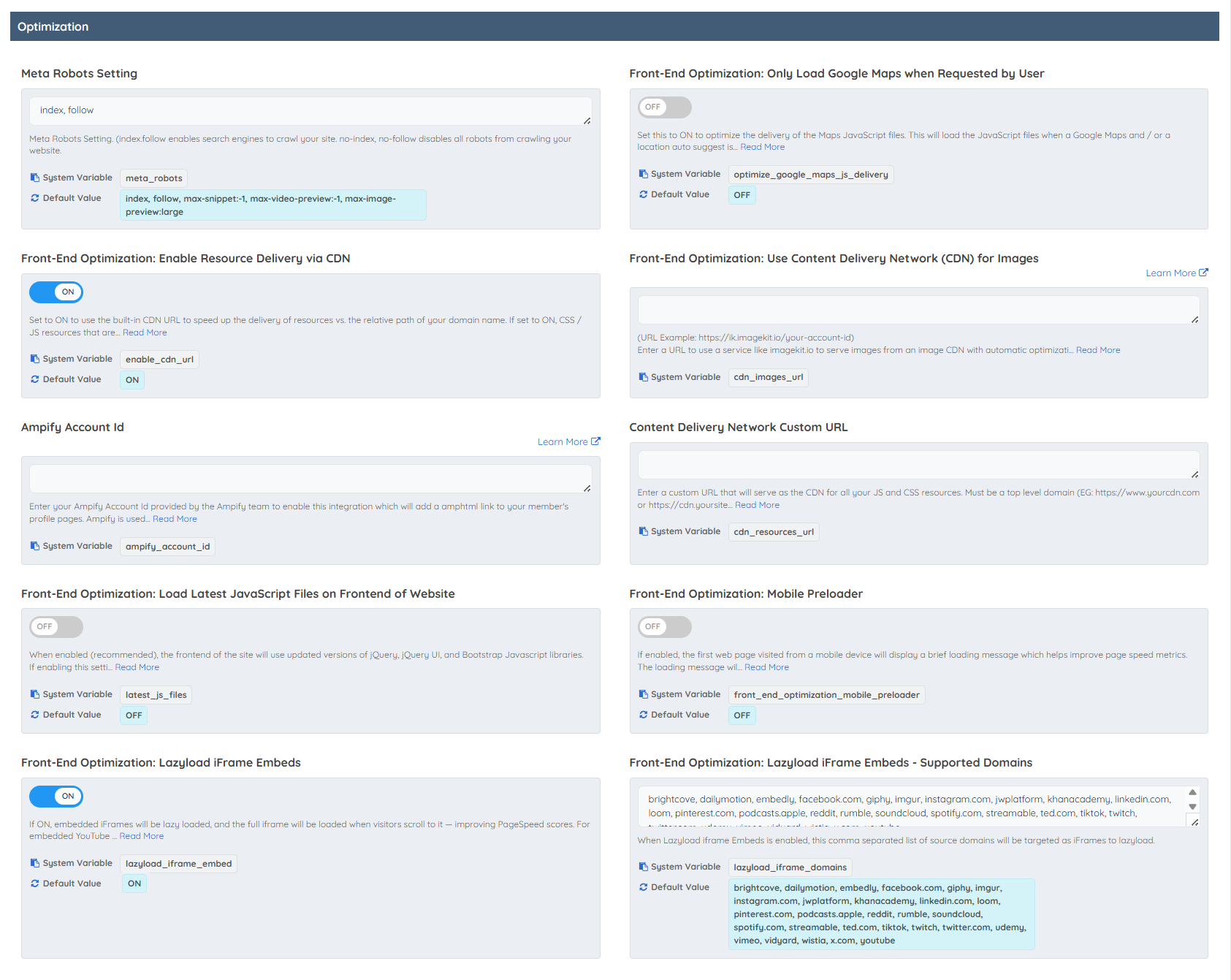 This section outlines key configuration settings and optimizations available for enhancing the website's performance, security, design, and administrative experience. These settings are categorized into four primary sections: