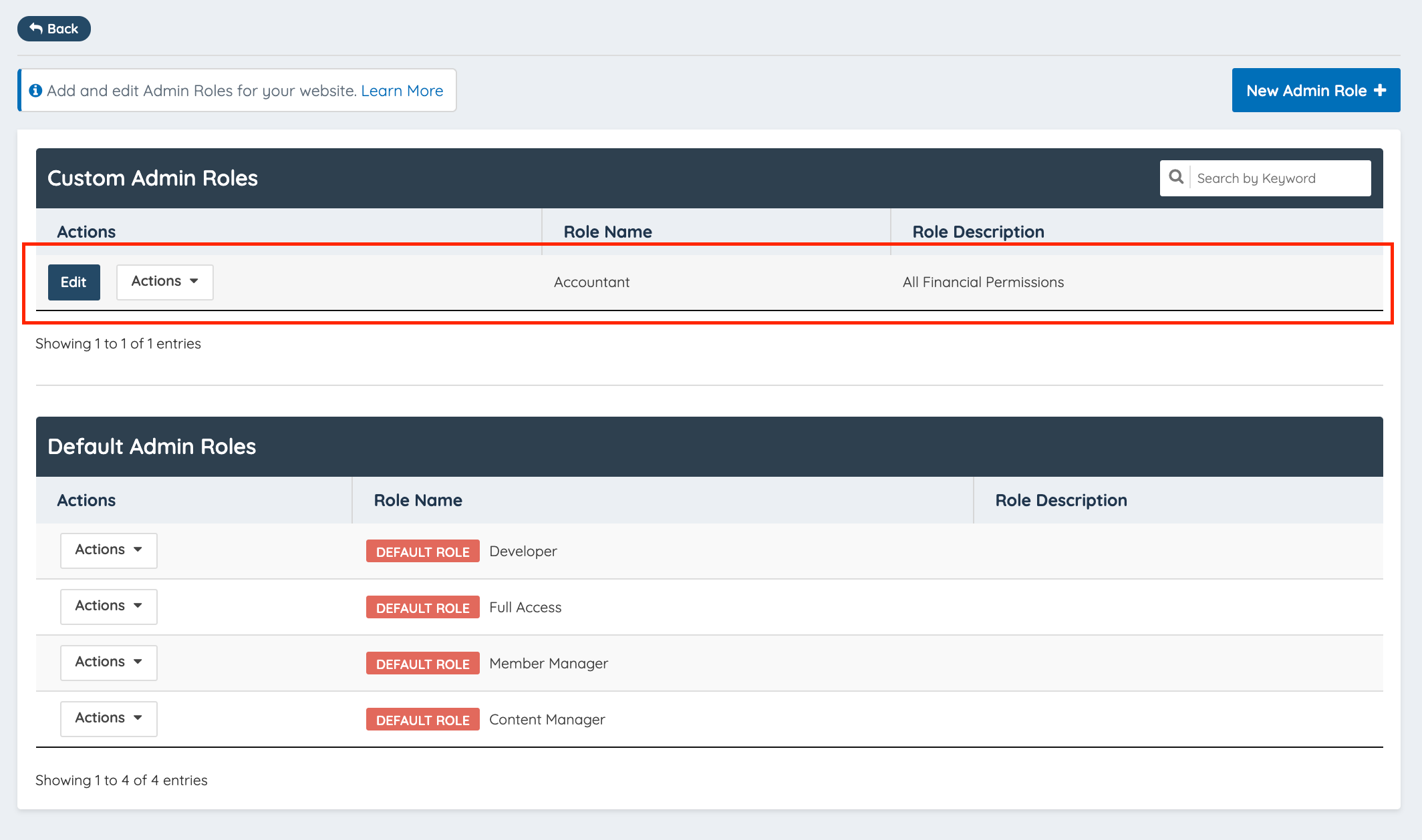 If a Role has not been selected for an Admin Account, the Admin account will have access to all pages in the Admin area.