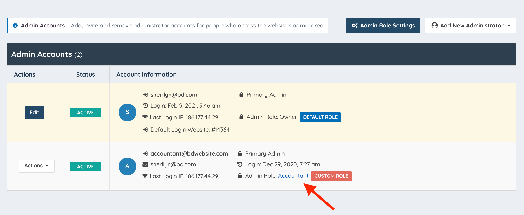 Assign the new Role to an Admin account by either creating a new Admin account or editing an existing Admin account, and choosing a Role from the "Account Role" drop-down:
