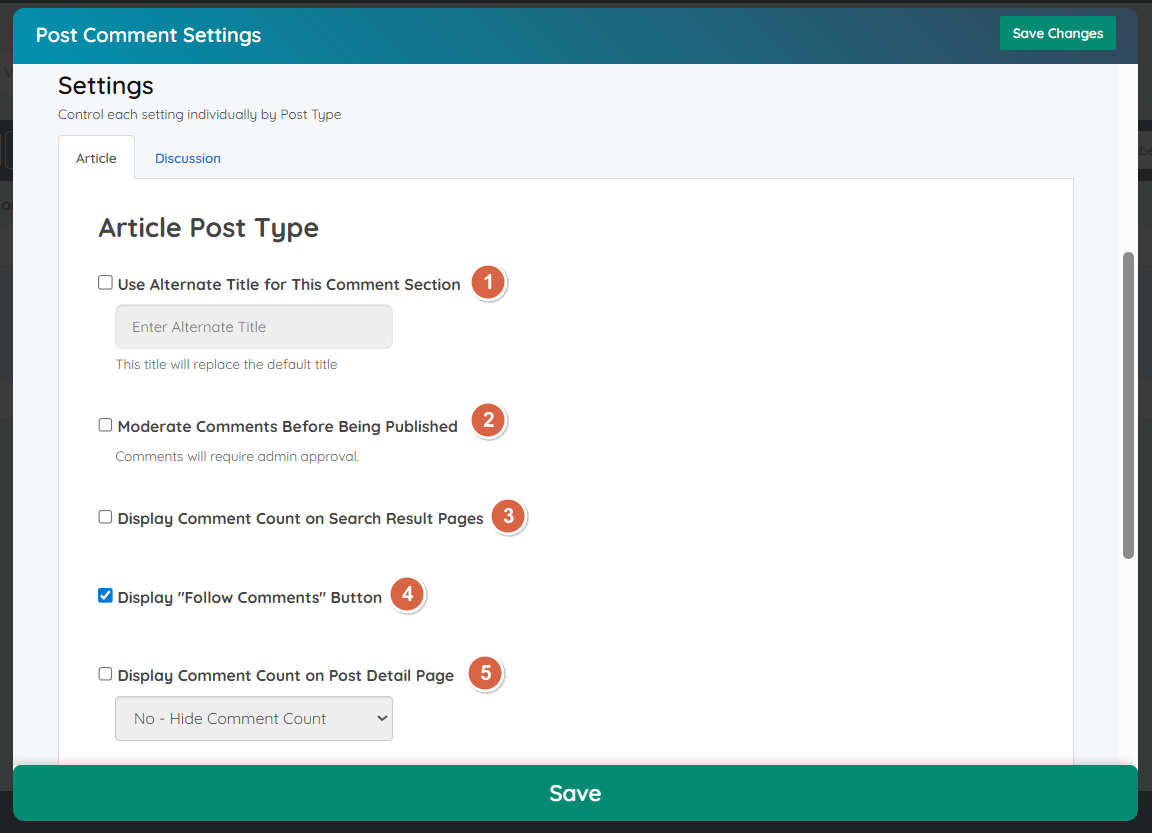 After selecting the post types that allow comments, a list of settings will appear to configure the functionality per post type, click on each tab to review them: