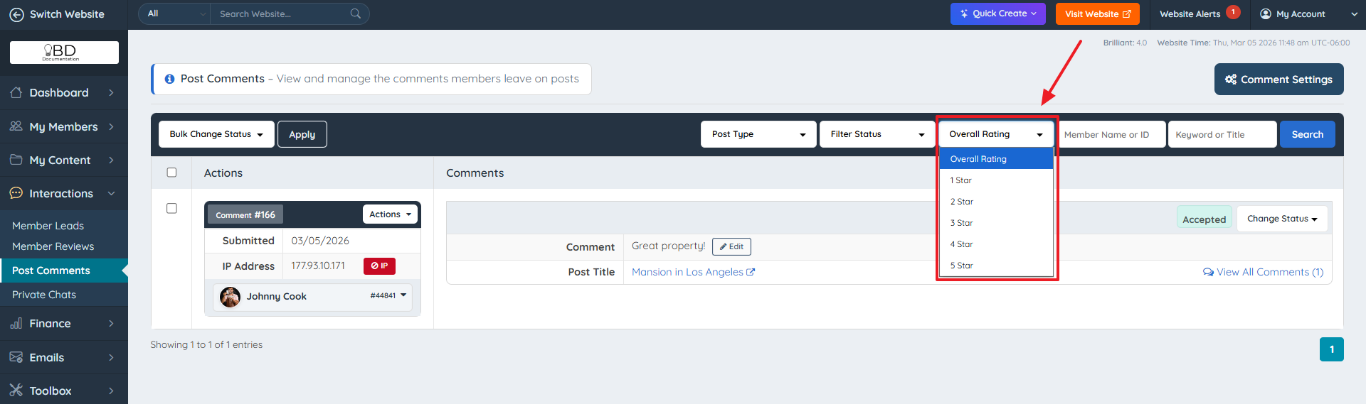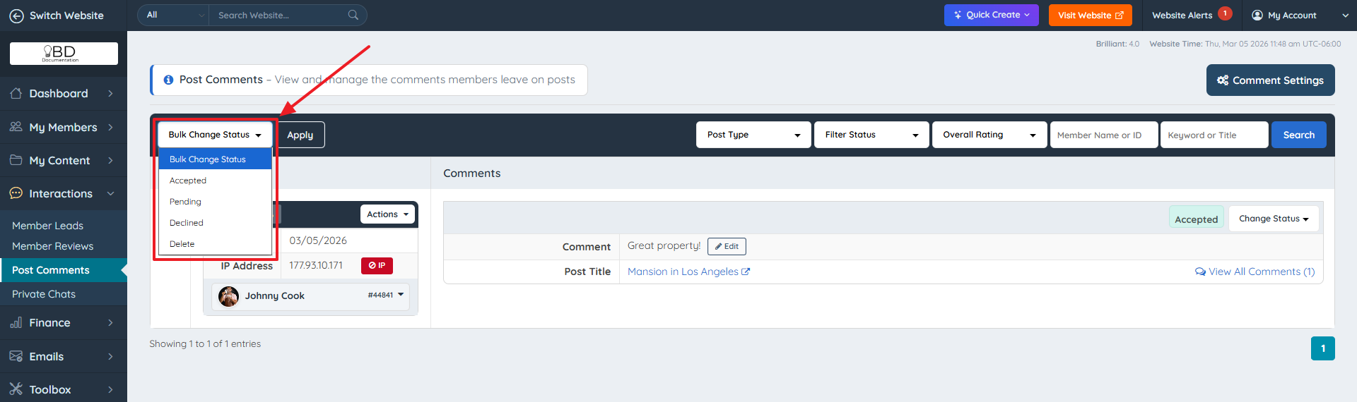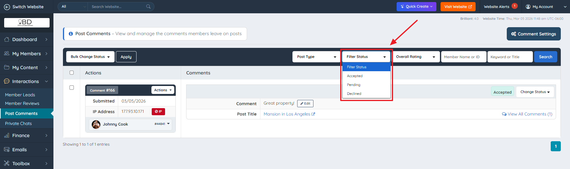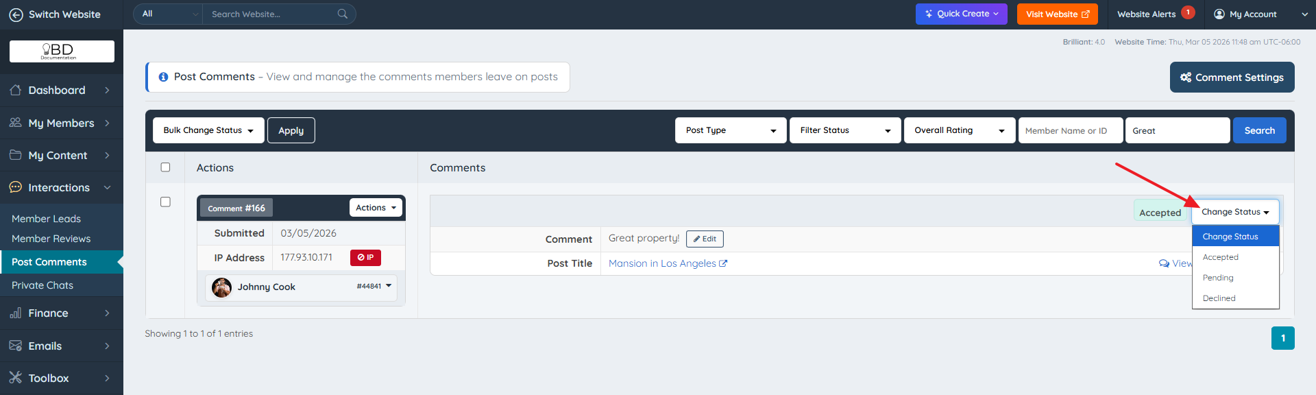 Comments can be filtered by status: Accepted, Pending, or Declined.