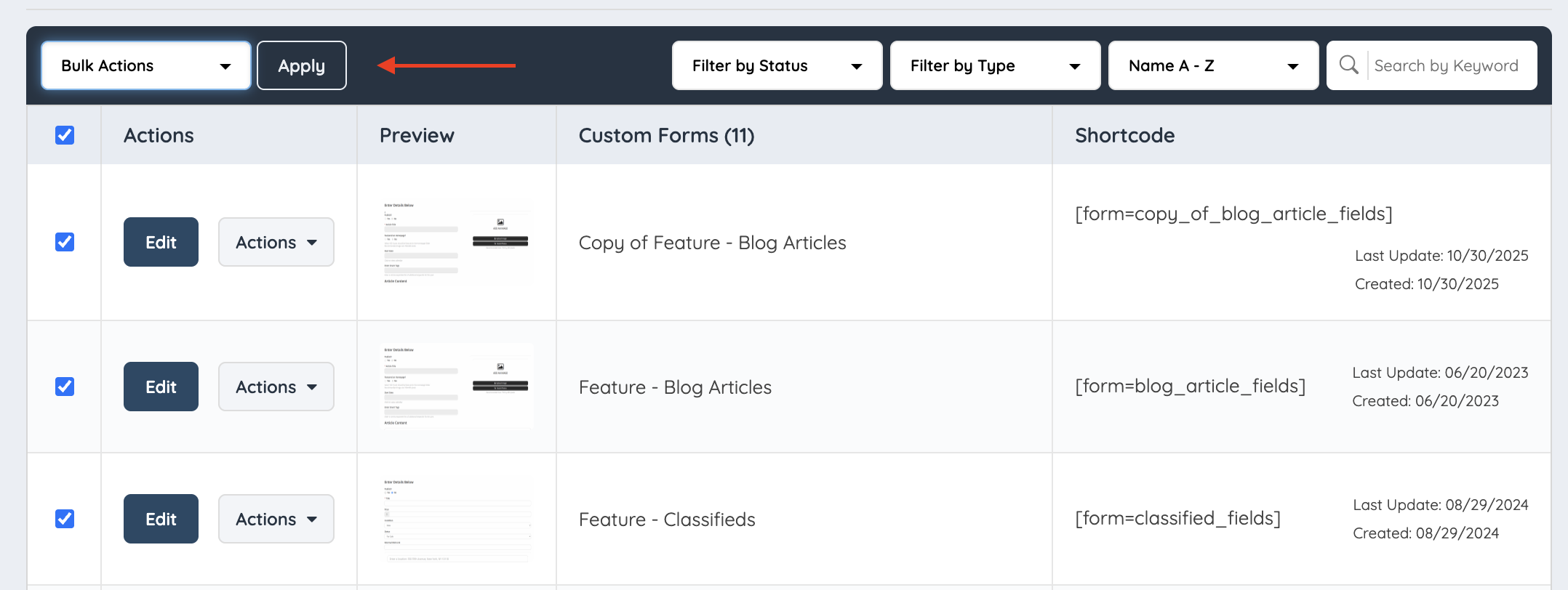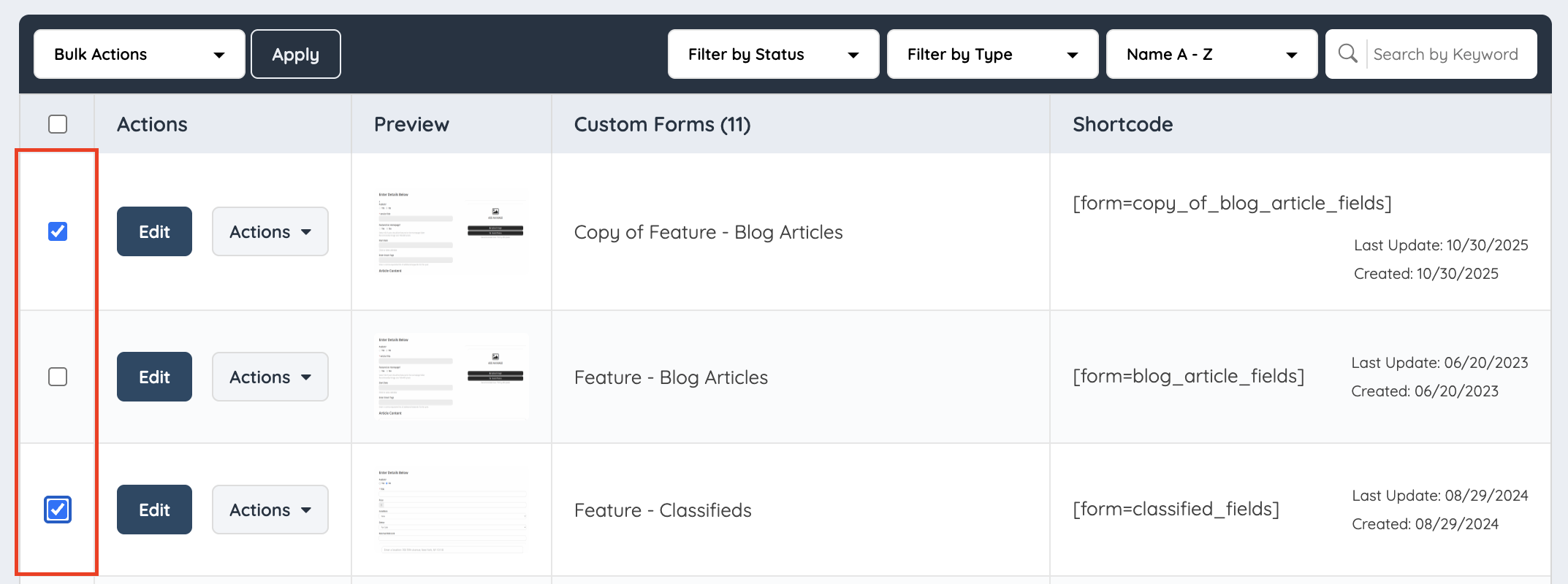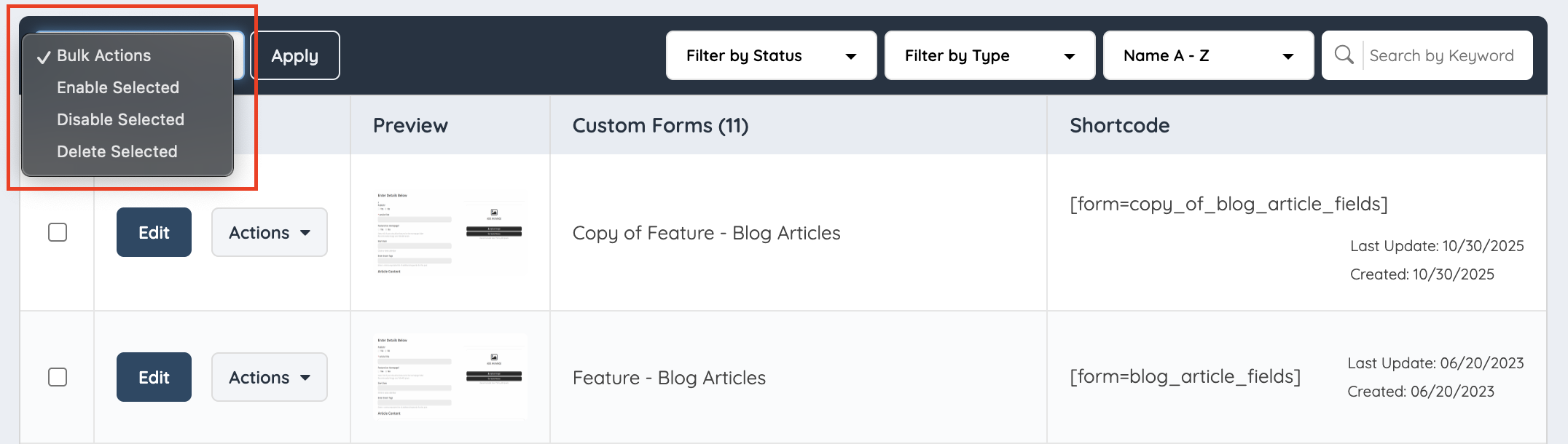 Please keep in mind that bulk actions apply to only custom or brand new forms, these actions are not available for default forms.