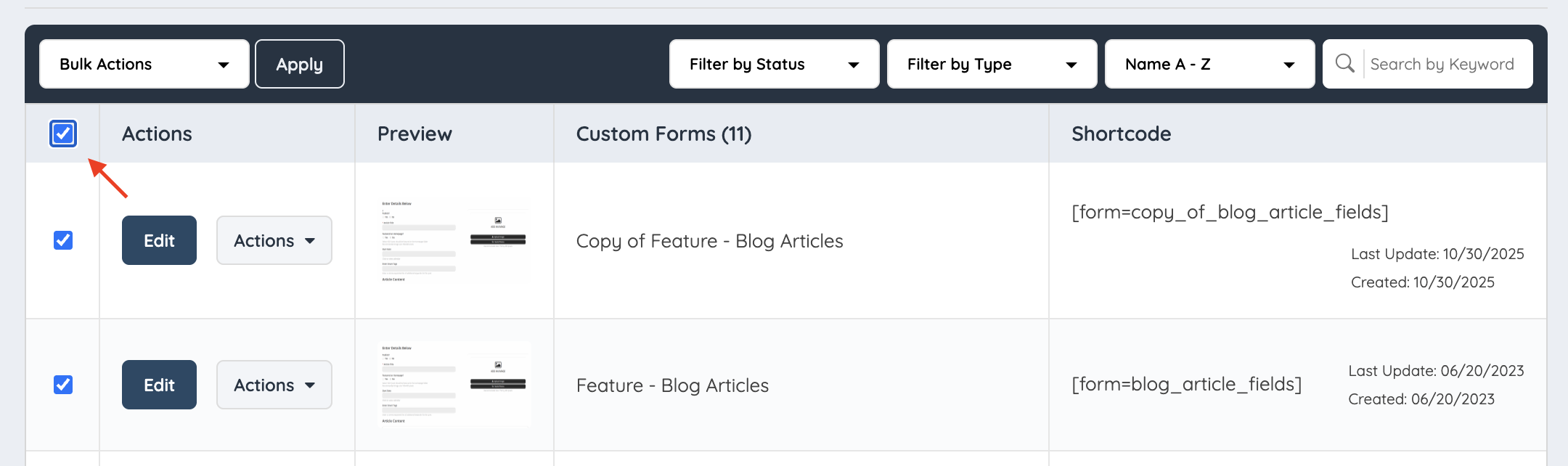 To perform a bulk action on forms, either select all forms by clicking on the checkbox specified below: