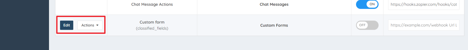 The actions column is going to display Edit and Delete options for Custom Webhooks. Default Webhook Events can't be deleted.