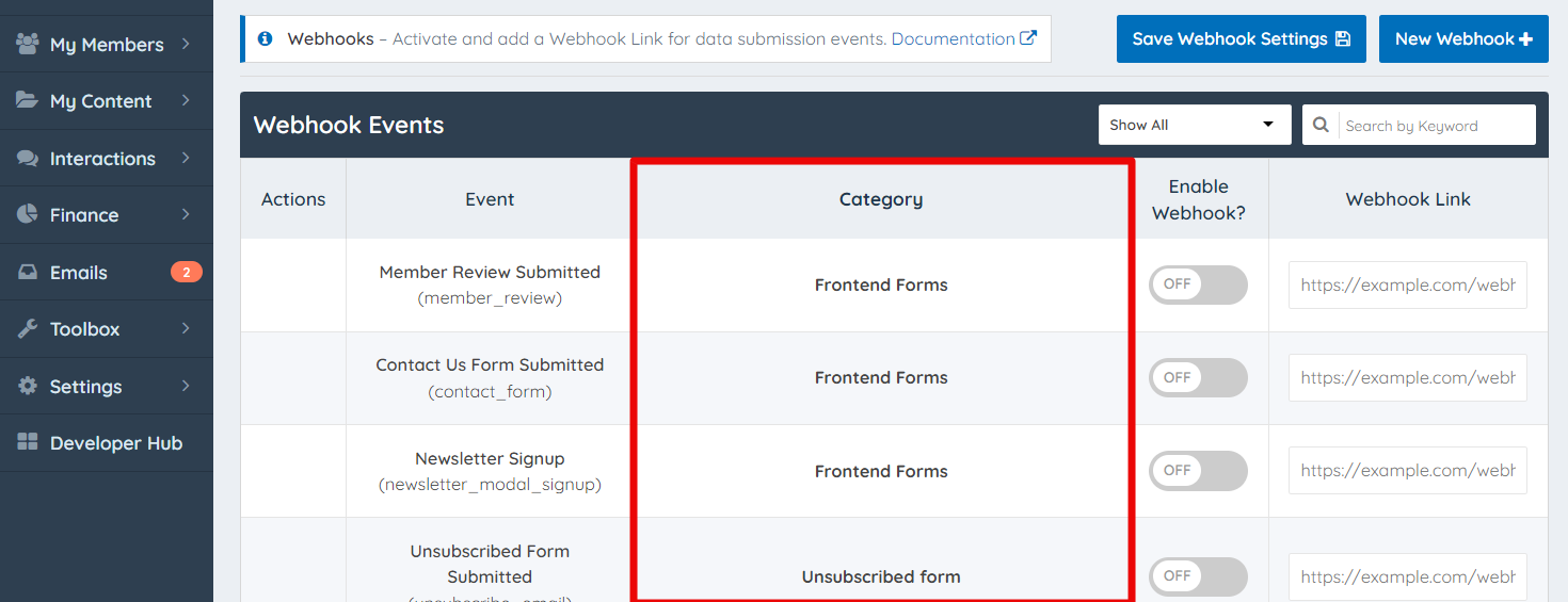 To set up a form to send submitted data to a custom Webhook URL, navigate to the Developer Hub >> Webhooks.