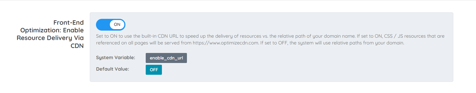 The advanced setting Front-End Optimization: Enable Resource Delivery Via CDN allows CSS / JS resources that are referenced on all pages to be served from https://www.optimizecdn.com. If set to OFF, the system will use relative paths from the domain, but if turned ON, it speeds up the delivery of resources vs. the relative path of the domain name.