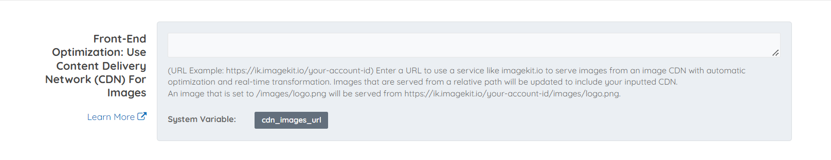 The Front-End Optimization: Use Content Delivery Network (CDN) For Images advanced setting allows user to enter a URL to use a service like imagekit.io to serve images from an image CDN with automatic optimization and real-time transformation. Images that are served from a relative path will be updated to include your inputted CDN. For example, an image that is set to /images/logo.png will be served from https://ik.imagekit.io/your-account-id/images/logo.png.