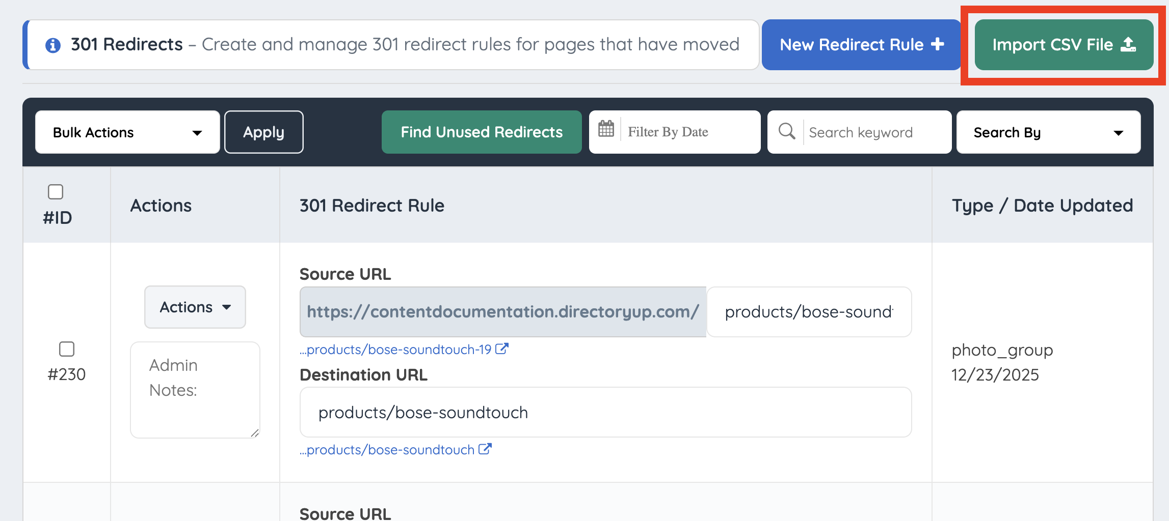 Important Note: For type "import" can also be specified to identify which redirects were imported and which ones were created by the system.