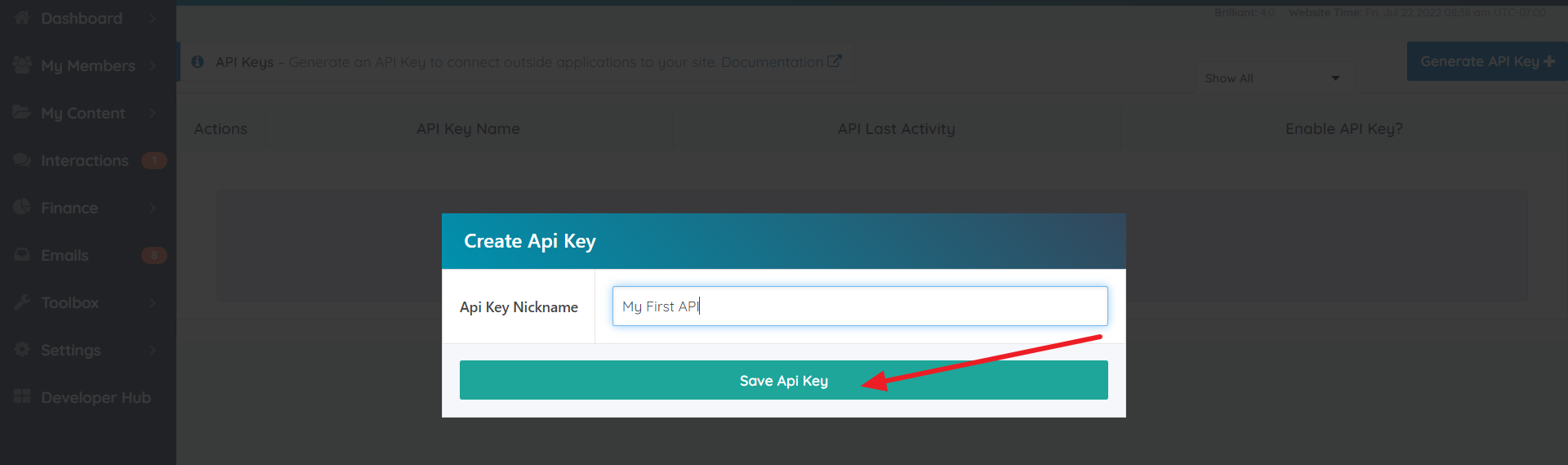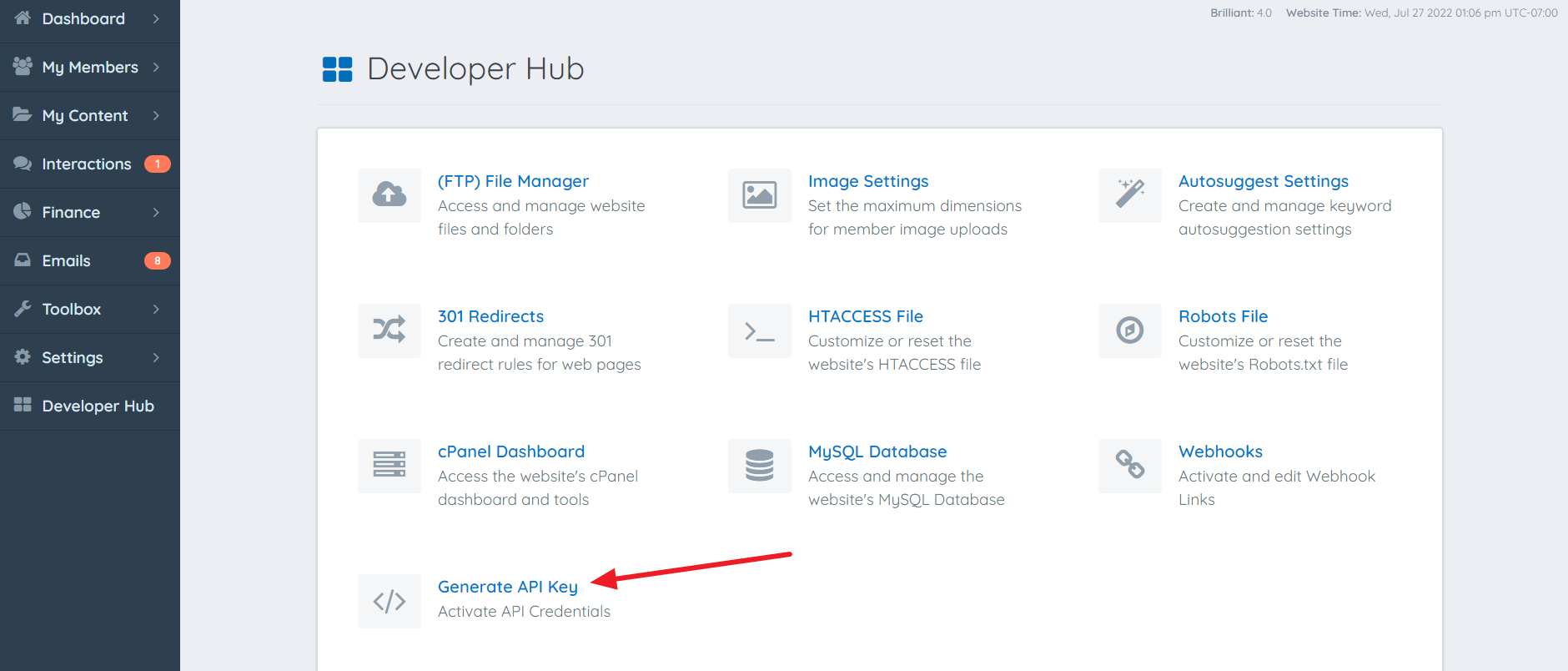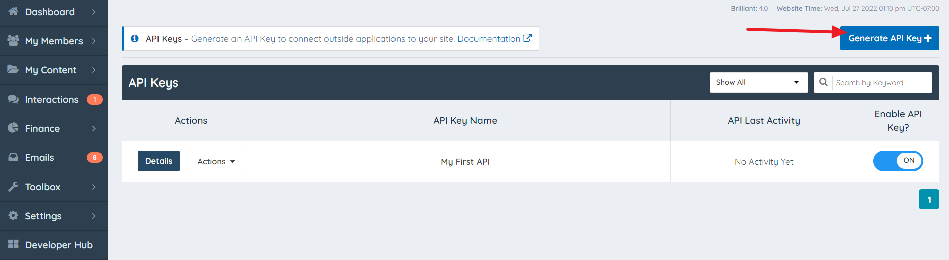An API Key can be accessed and generated by navigating to Developer Hub >> Generate API Key: