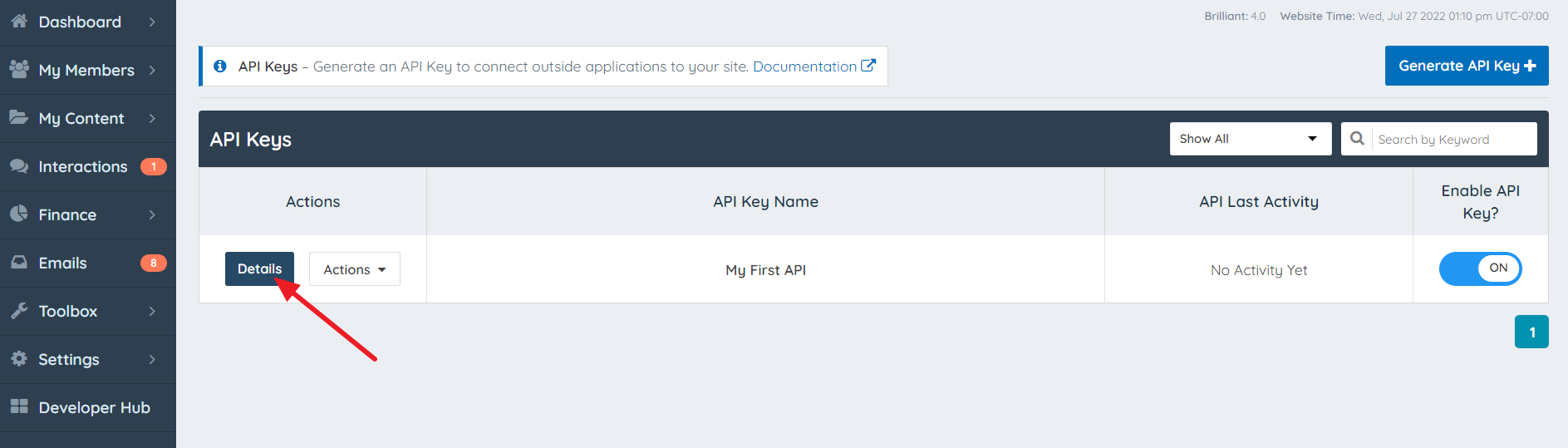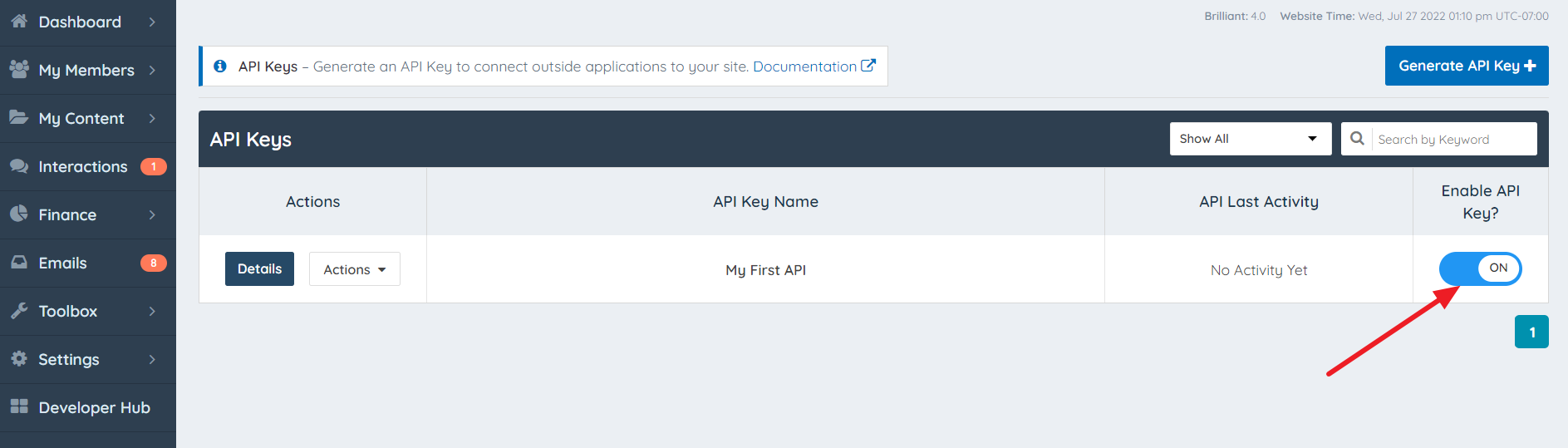 In this article, we will be going over how to generate and manage API Keys to connect outside applications to the site. The website's API allows for creating, reading, updating, and deleting information from the website by passing information to specific URLs or "API Endpoints". In order to make sure these requests are secure, a website's Admin must first generate a unique "API Key" to send with these requests.