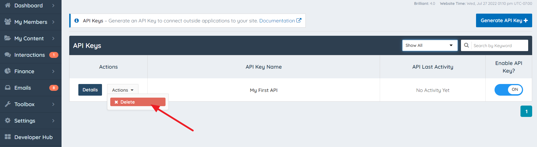 If an API Key is no longer needed, it can be deleted using the Actions dropdown: