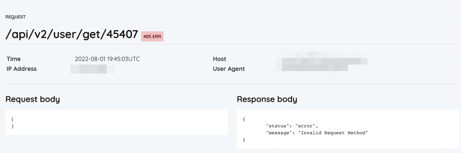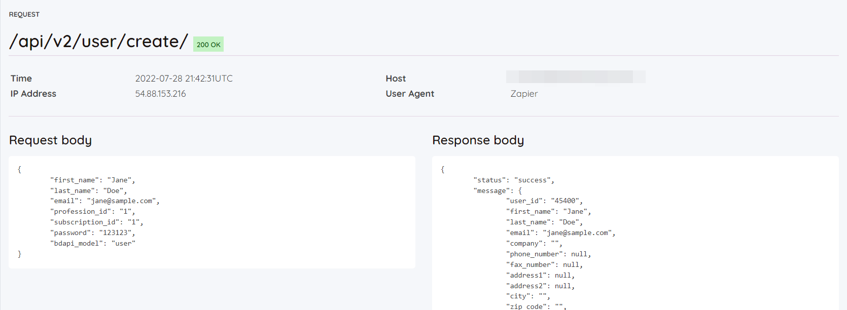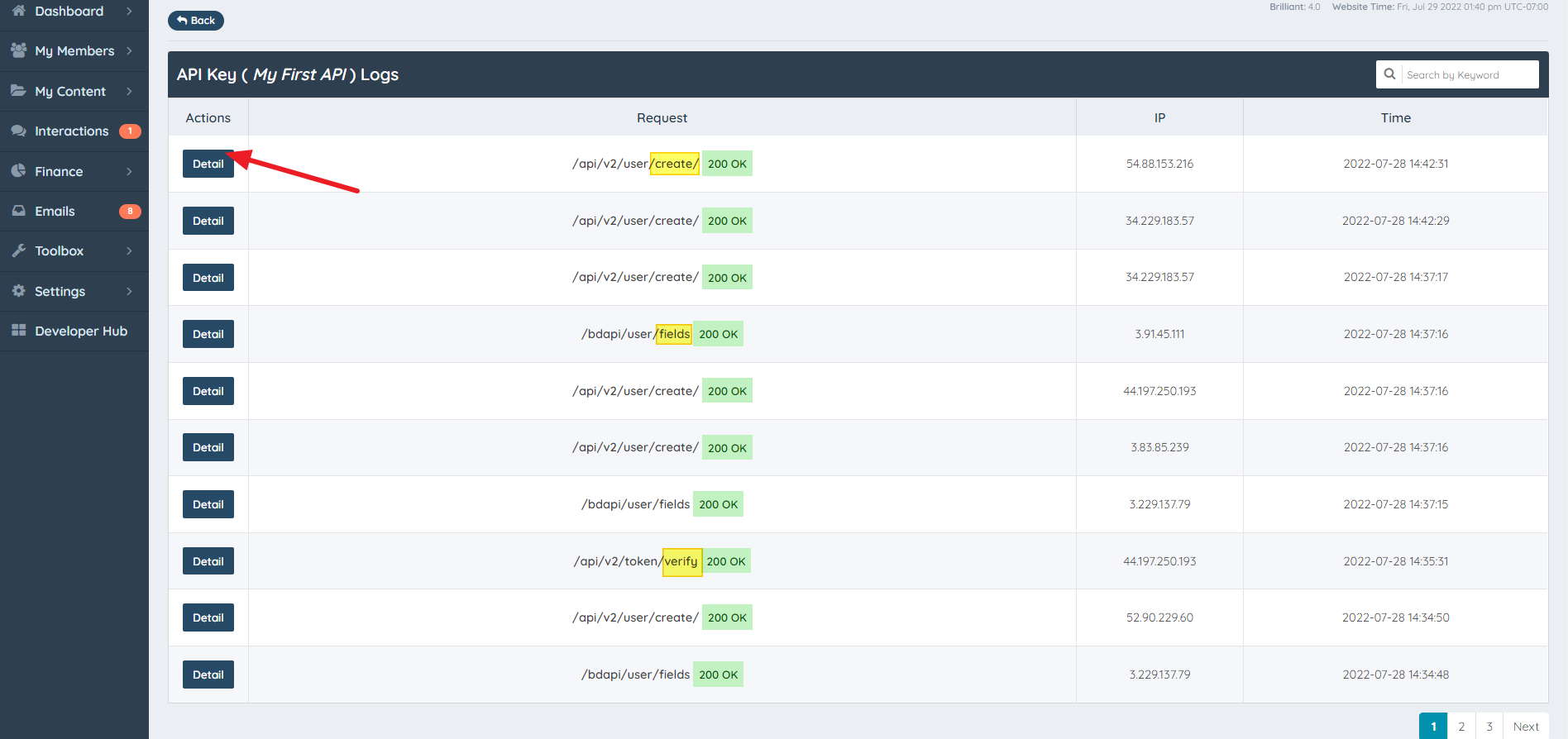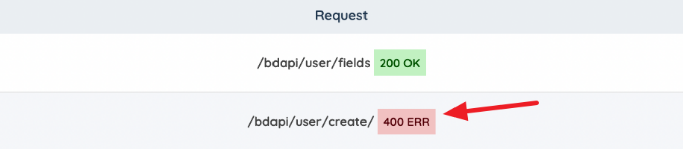 There are three types of completed requests; create, fields, and verify. The details of any items in the log can be seen by clicking on the Detail button: