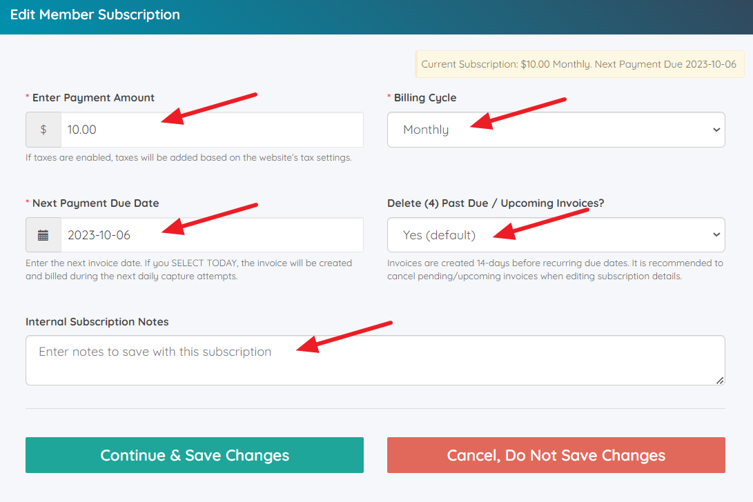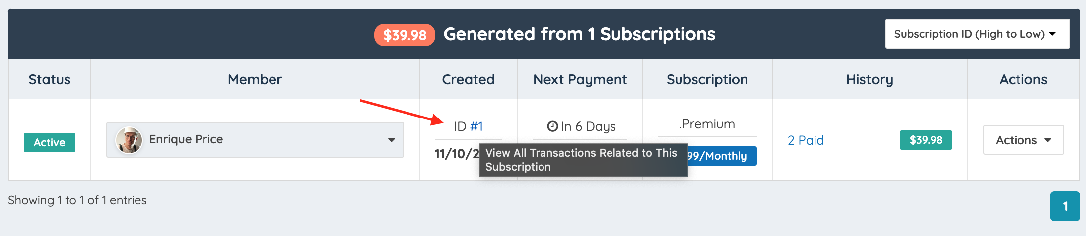 The Next Payment and Subscription columns will show important information regarding the next due date and the current membership plan: