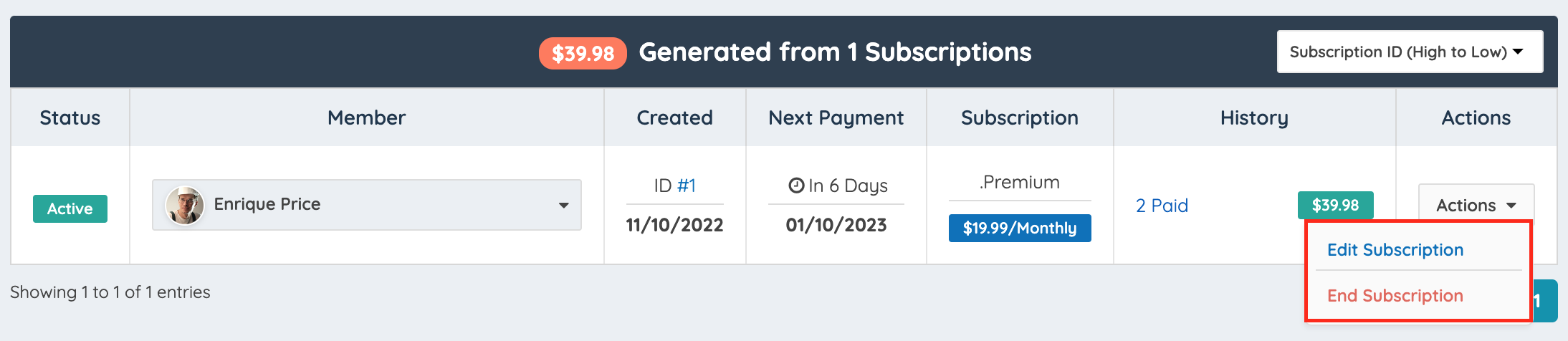 The Actions Drop Down menu will provide the options to either End or Edit the Subscription: