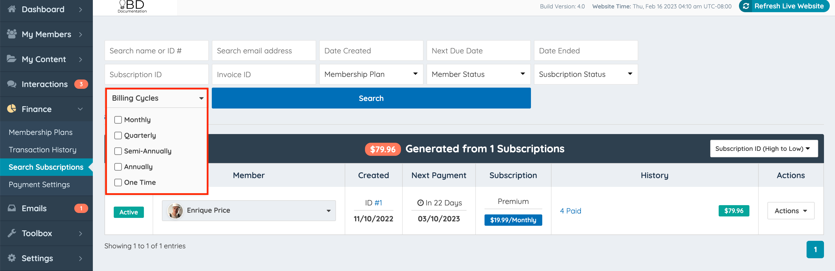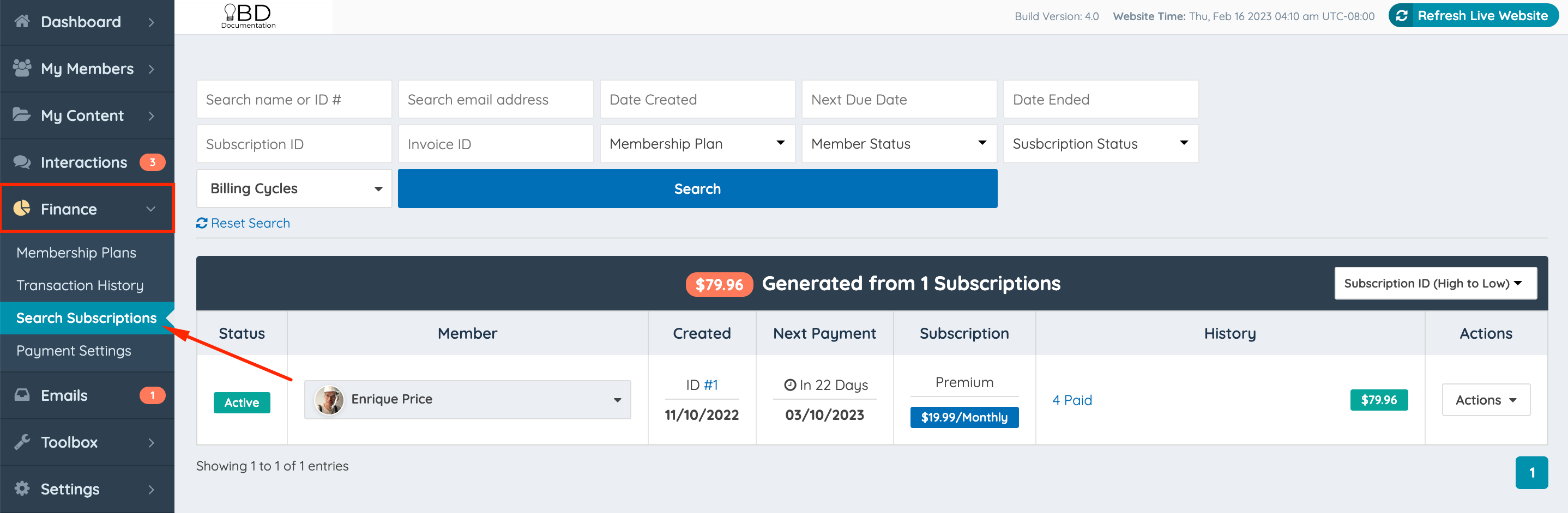 The Search Subscriptions page gives the Admin access to a set of filters to search and edit subscriptions from all members of the site.