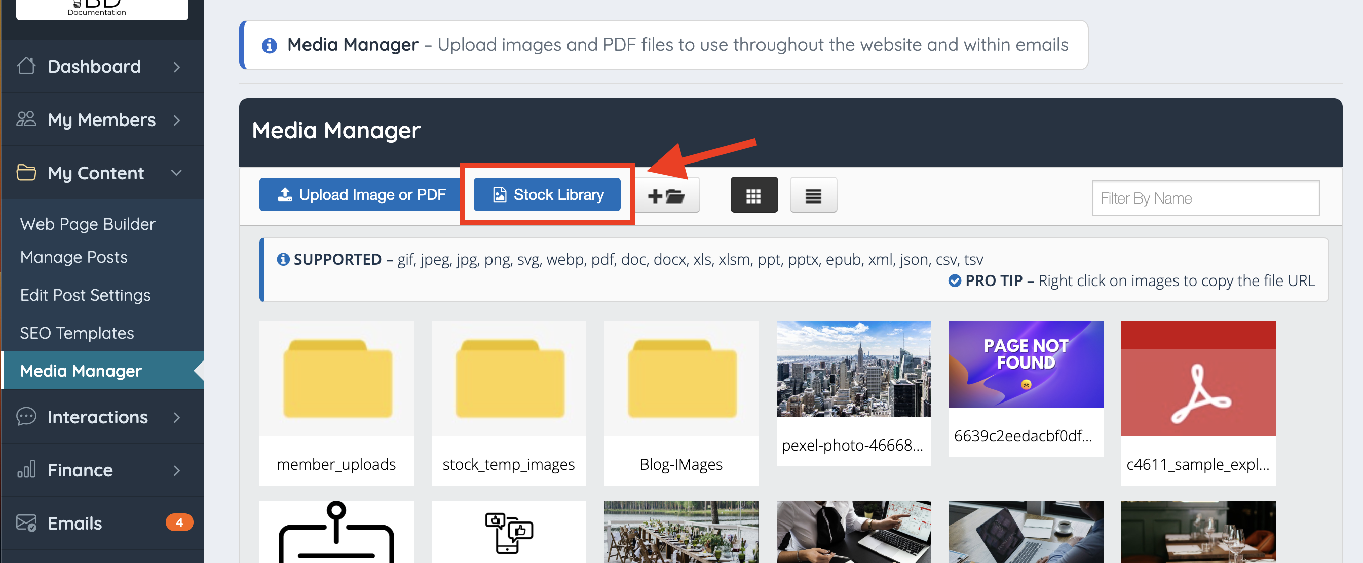 Go into the media manager and click the "Stock Photos" button.