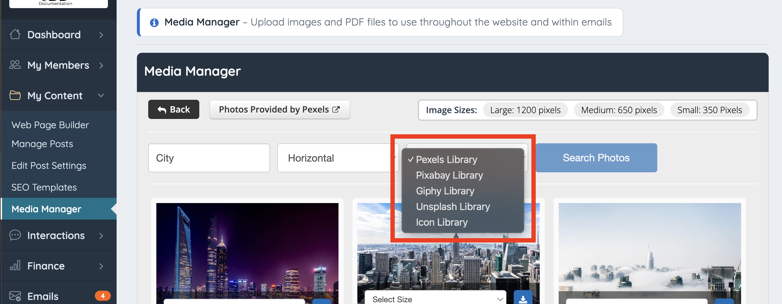 Type in the keyword to search, select the Orientation (square, vertical, horizontal), choose from the dropdown the source (Pixabay, Pexels or Giphy) and click on "Search Photos":