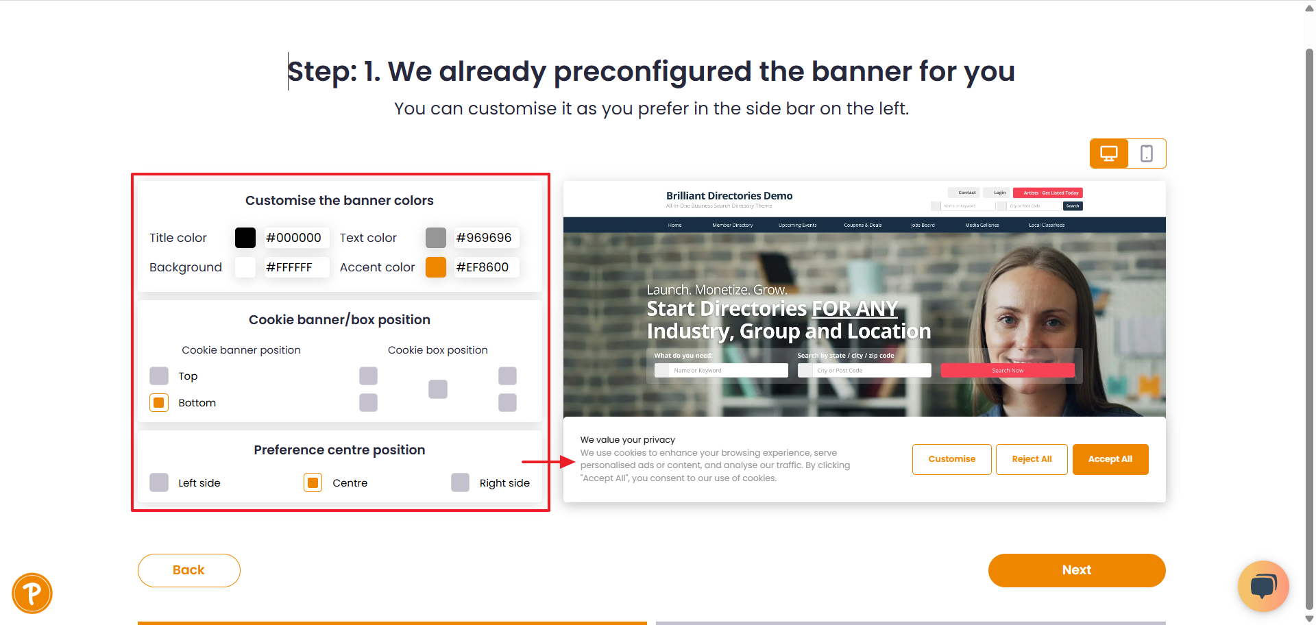 CookiePal offers an already preconfigured the banner. Customise the layout, colors, position, and content text to align with branding and legal requirements using the side bar on the left.