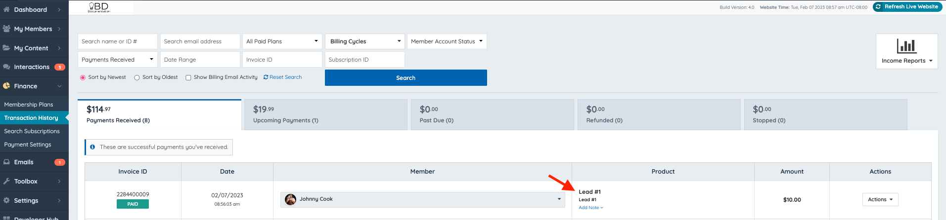 6. The lead purchase will show up as a "Lead" in the "Transaction History".
