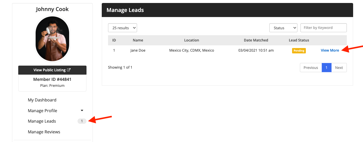 4. If the purchase is successful, the member will receive a success message with a direct link to view the complete details of the purchased lead: