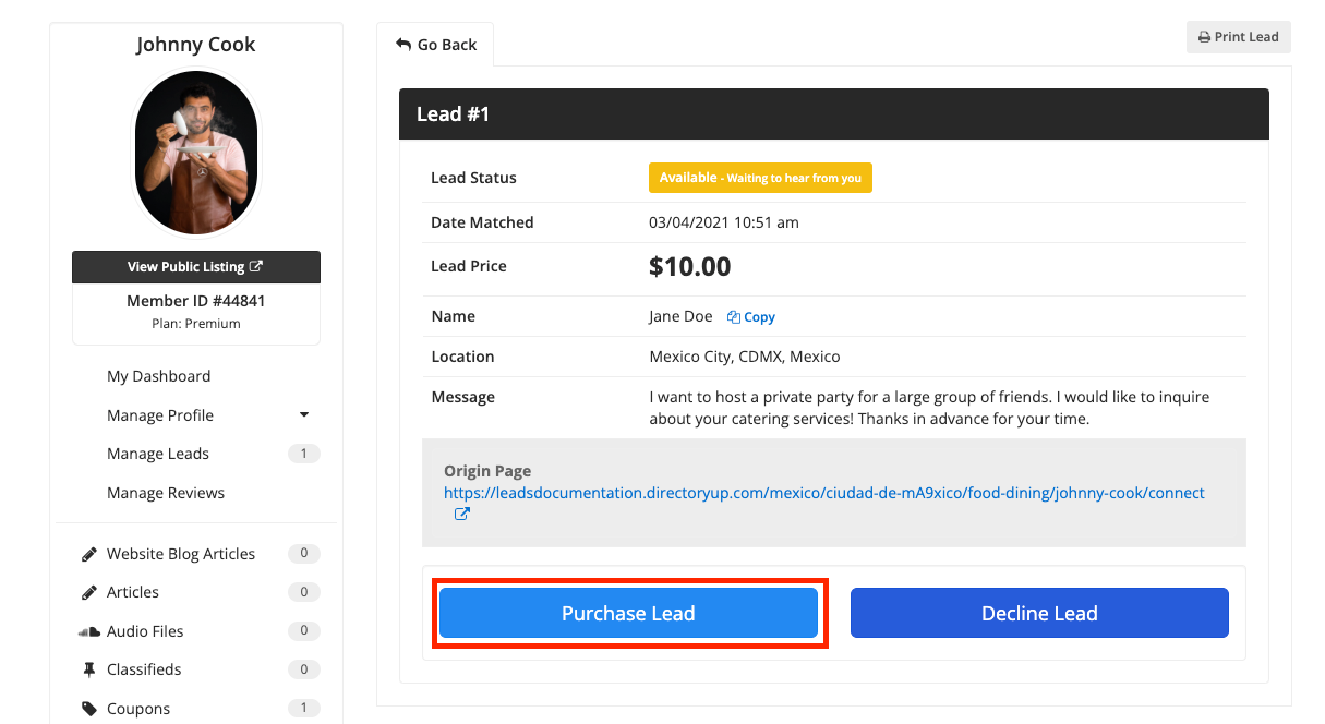 The member must click on "Purchase Lead" in order to view the full contact details (if email setting is set to "Preview"):