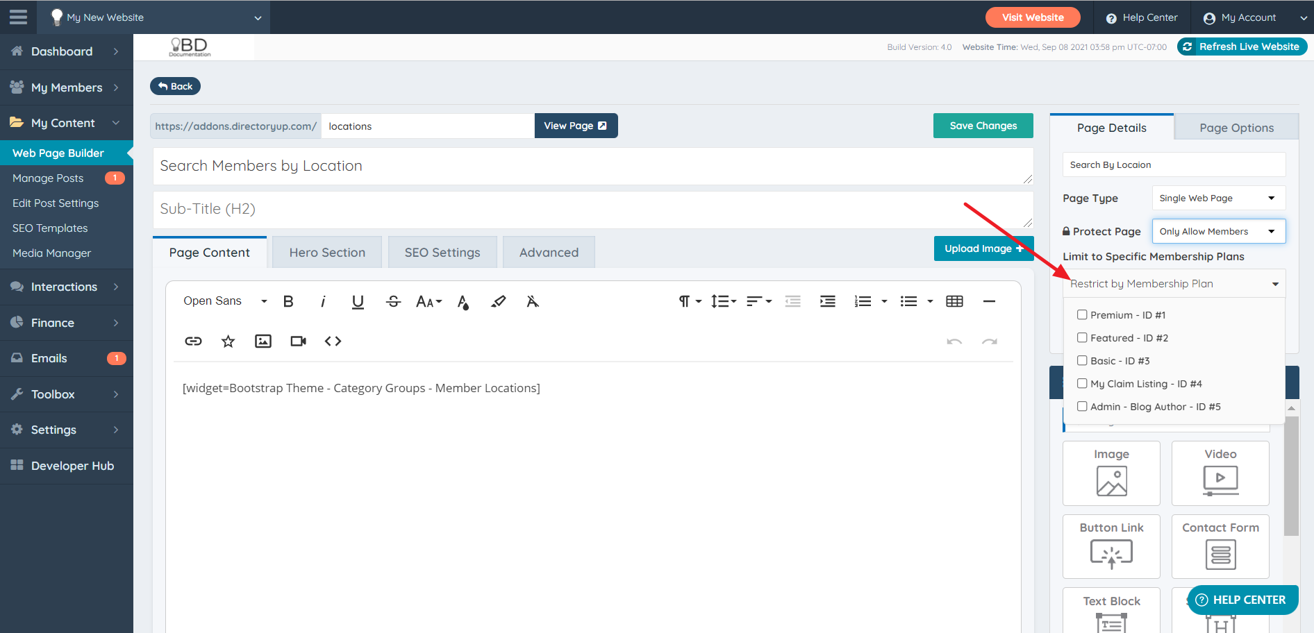 On the right sidebar settings, check the "Protect This Page" and select the Only Allow Members so non-members can not see this page. Finally, click on "Save Web Page". Next is the option to select which members get to see the page: