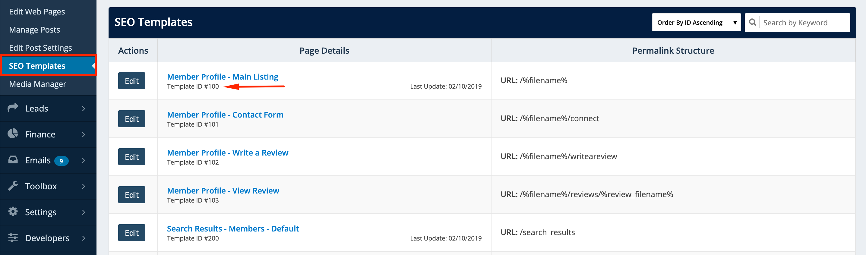 All of the SEO Templates for member search results pages can also be accessed by navigating to Content >> SEO Templates in the left navigation menu of the Admin area:
